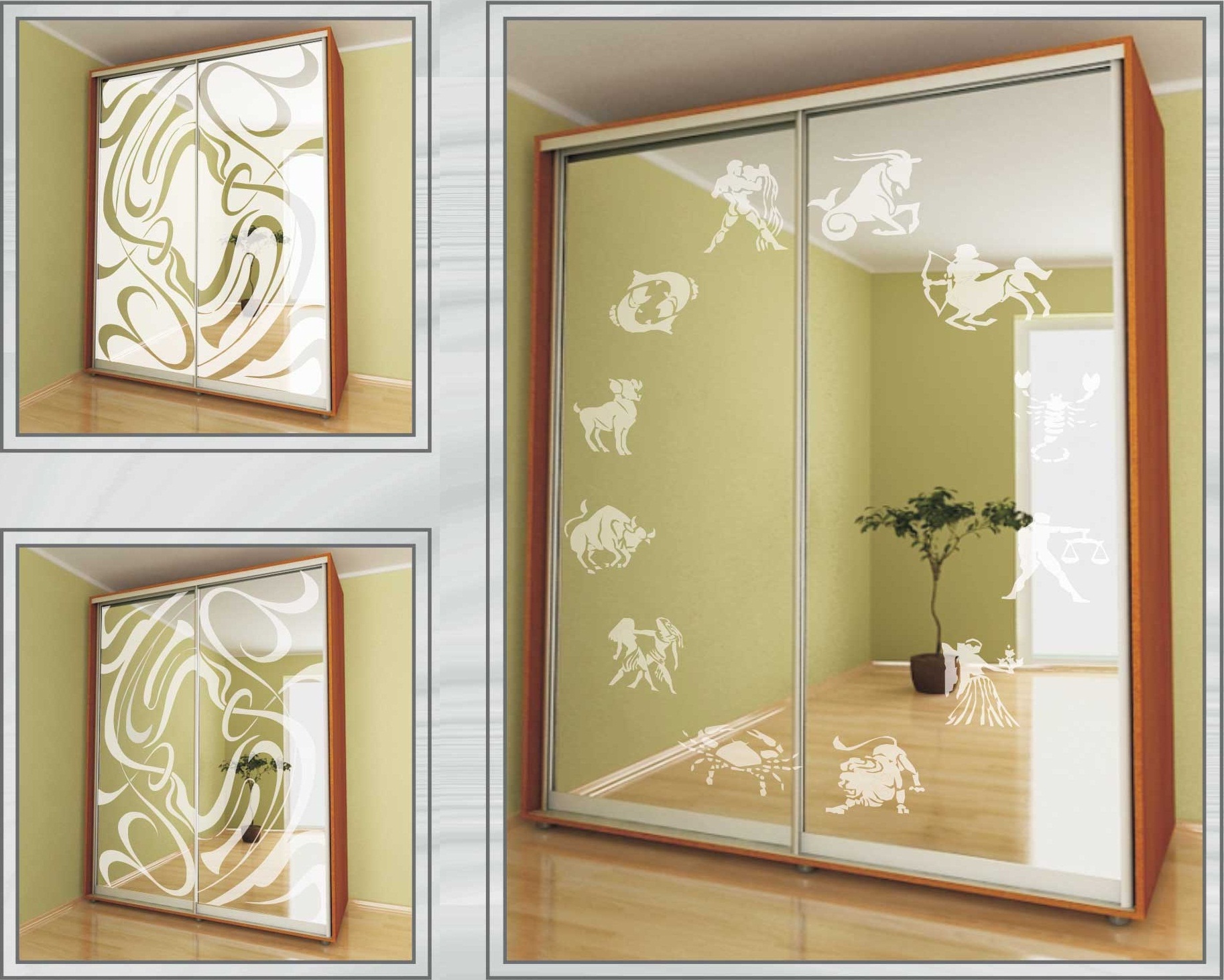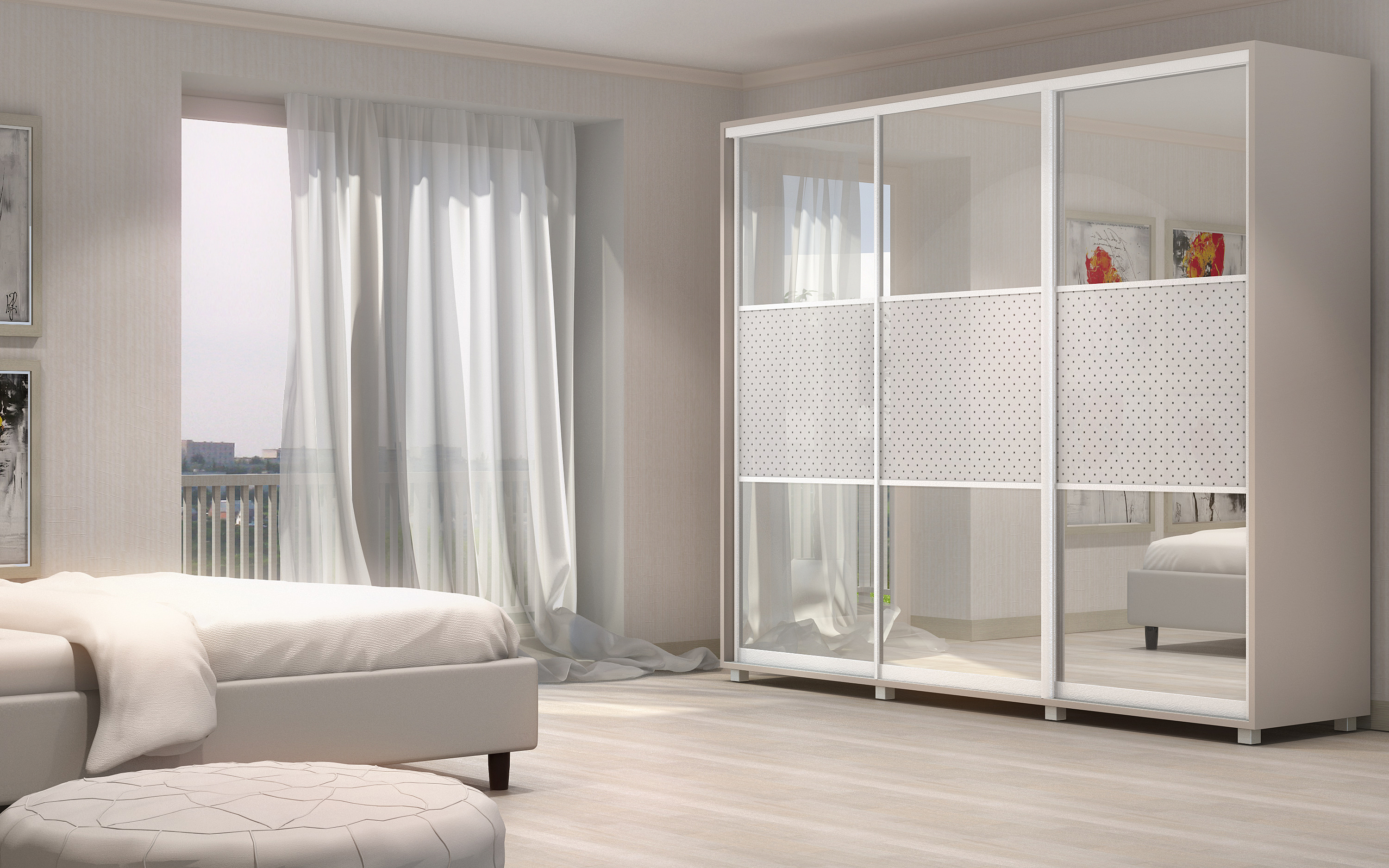 Bright wardrobe with mirrored doors and patterns