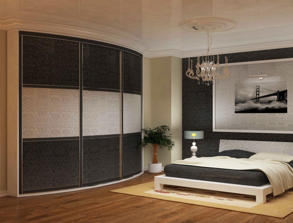 The diagonal-angular or radial cabinet has a slightly convex facade. Such “compartments” are more complicated and more expensive than linear models, since it is difficult to adjust the curvature of the convex door to a circular guide. But these structures have a maximum internal volume and a beautiful facade. Most often these are designer sliding wardrobes.