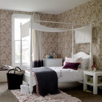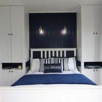 Instead of a bedside table, when there is no other solution, use hanging shelves, and instead of a table lamp, use a sconce. The main thing is that they should be at a safe distance and made of materials that are not able to harm a sleepy person getting out of bed. Children and adolescents sometimes fall from a bed in a dream, then it is better to refuse a table, and buy a sofa bed with shelves on handrails or with a side.
