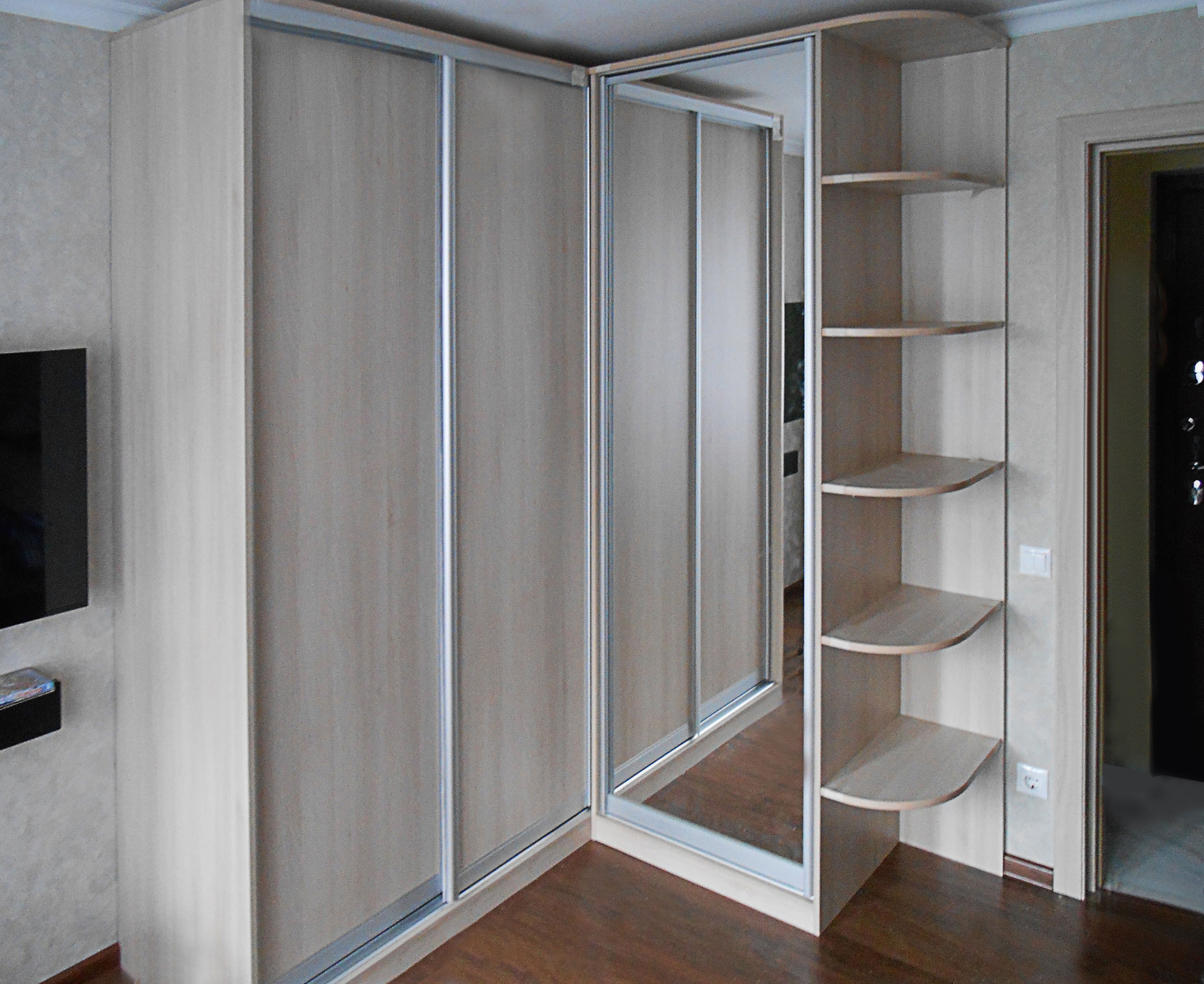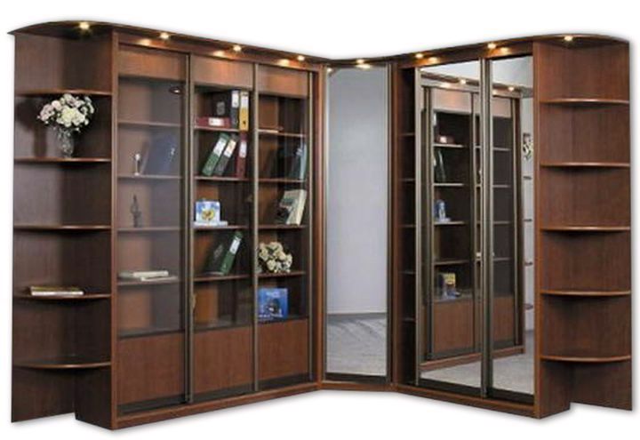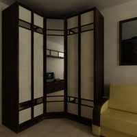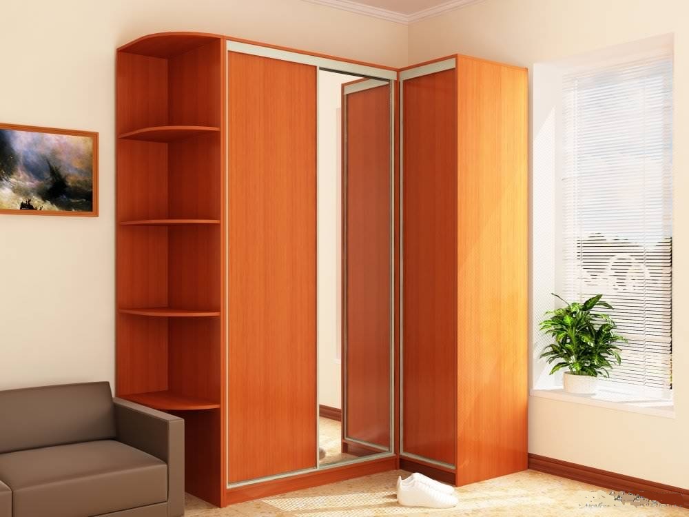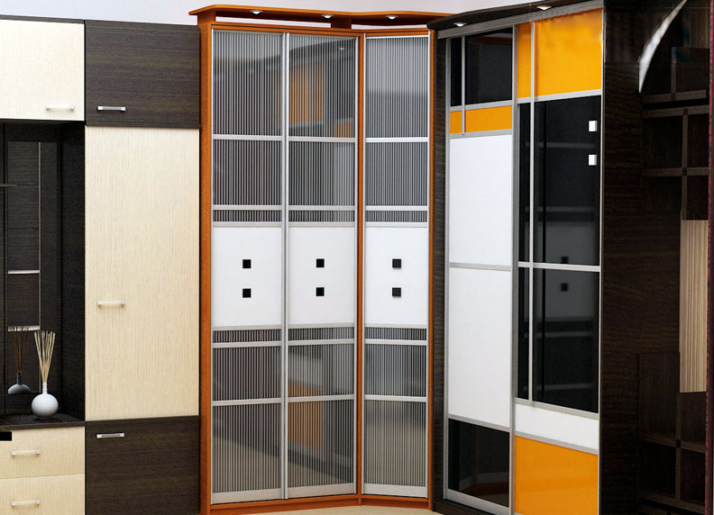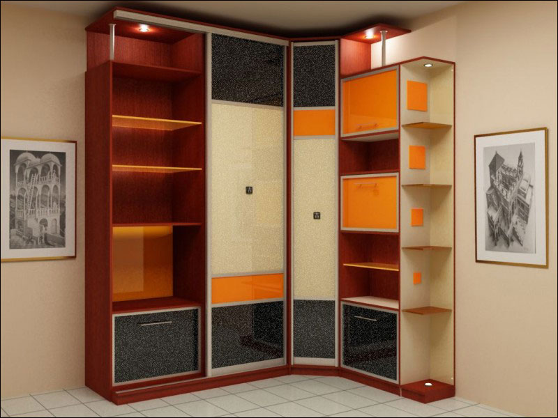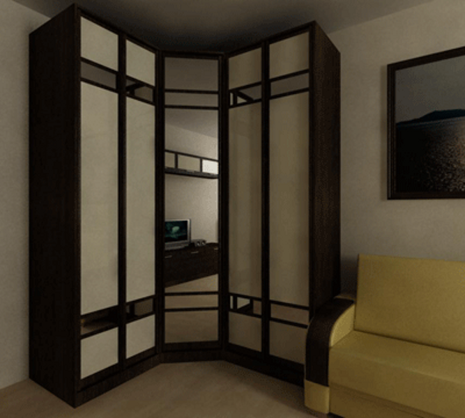 Having sliding doors, corner wardrobes in the form of a compartment in the living room will help to save useful area. Models are selected by photo, in order to increase the ergonomics of individual places.