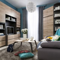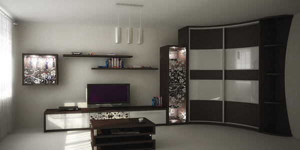 To preserve the unity of style, customers prefer to order cabinets with a shape of an angle, and the walls specially select a suitable rounded set. The choice depends on the flooring. If the floor has a glossy lacquered base, then in the photo you can see that in such a living room, it is better to select models with similar elements of the body decoration.
