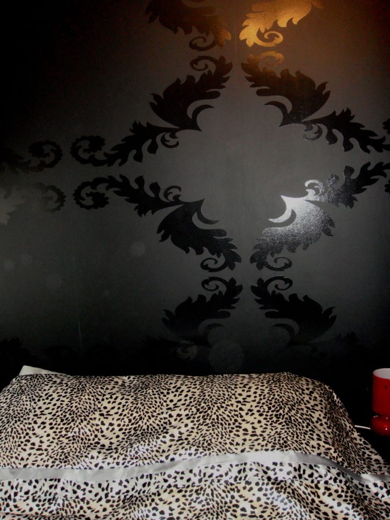 Bedroom with black wallpaper