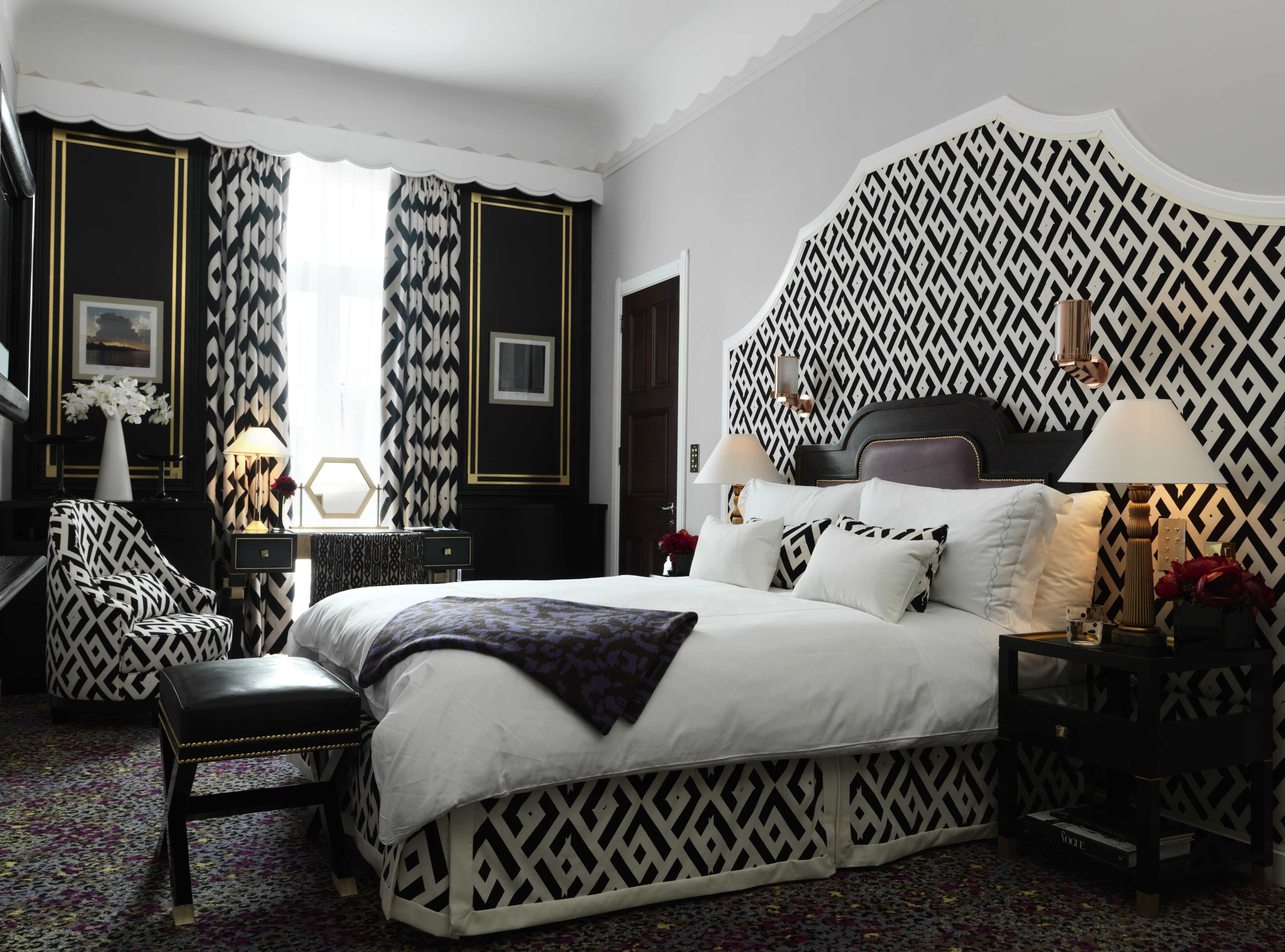 Chic bedroom with black wallpaper