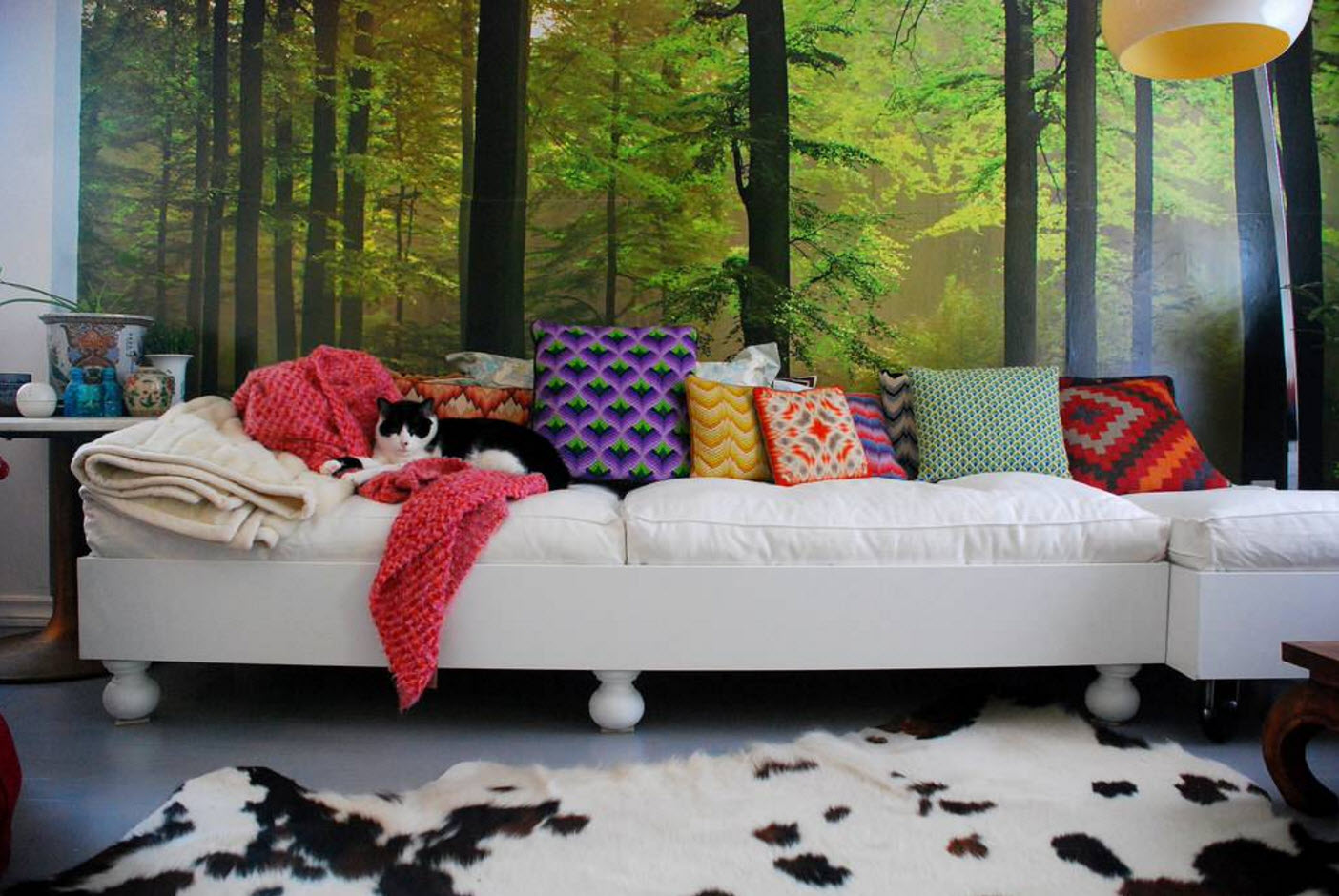 - If this is an eco-design, wall murals, large-scale prints on the theme of nature or photo printing will be appropriate. The only difficulty is the choice of furniture for such a decoration of the only living room, so that the whole atmosphere is in harmony. If the murals are used in the hallway, which you want to visually expand, plots with steps, an open door or a panorama outside the window are appropriate, then with furniture everything is much simpler.