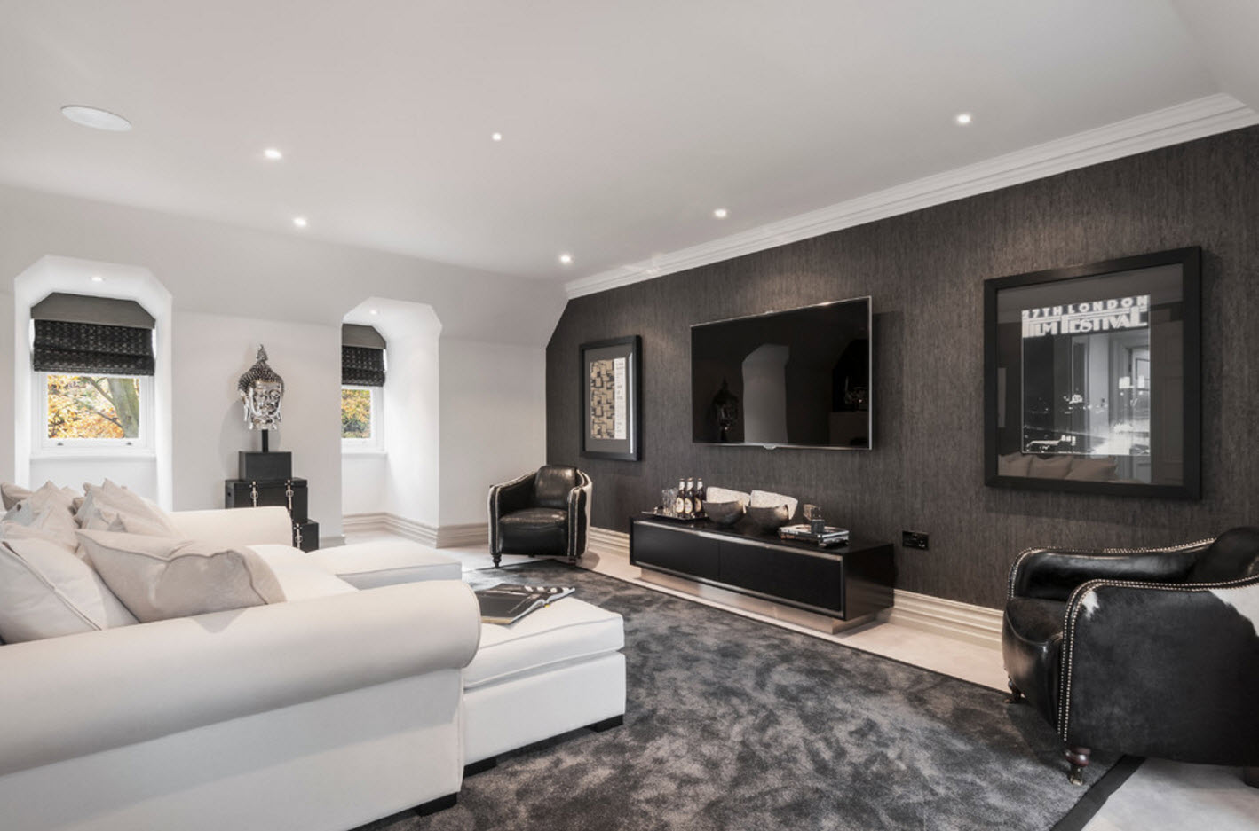 - An accent wall is often used by designers to create an exclusive interior. For this, an unexpected solution is used, for example, black velvet wallpaper. This is a great backdrop for a glass showcase with a collection of weapons, dishes, a rare figurine or exotic plants.