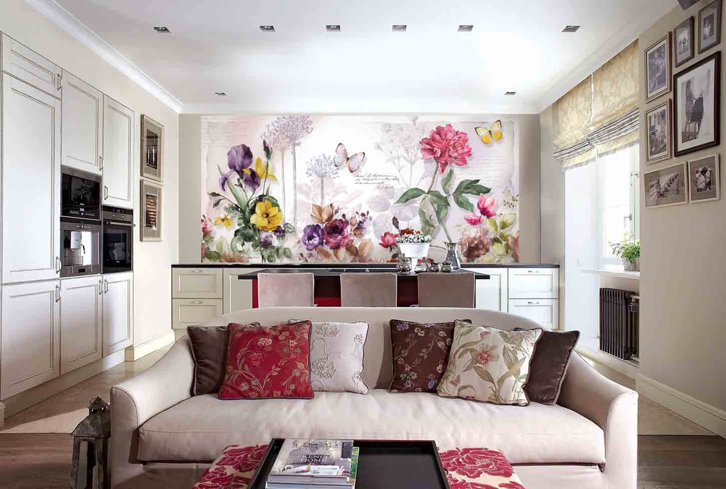 - Make the interior of the living room more harmonious.Often, several colors and shades are used in the decor, but it is not always possible to achieve harmony in their use. So, here are the murals and will be able to help in this problem. By choosing the right pattern and suitable colors, you can “assemble” the room into one integral space.