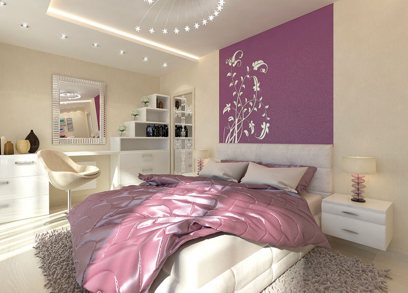 A vertical drawing will “raise” the ceiling a little, make the room more spacious. The floral ornament in the form of a diamond-shaped lattice also has the same property. However, the lower plane of the room will seem smaller than the actual size, so it is important to consider what the floors of the bedroom will be.