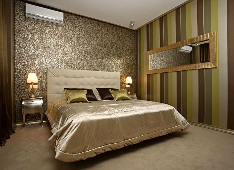 Designing a bedroom with combined wallpaper is much easier to make original and more attractive. However, it all depends on how much time is spent in this room. If you come to the bedroom after a hard day just to get enough sleep, you should not do expensive repairs. It is enough to choose a simple classic pattern for bedroom decoration, for example, a weakly pronounced strip with floral ornaments.