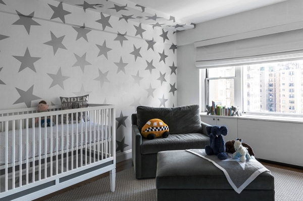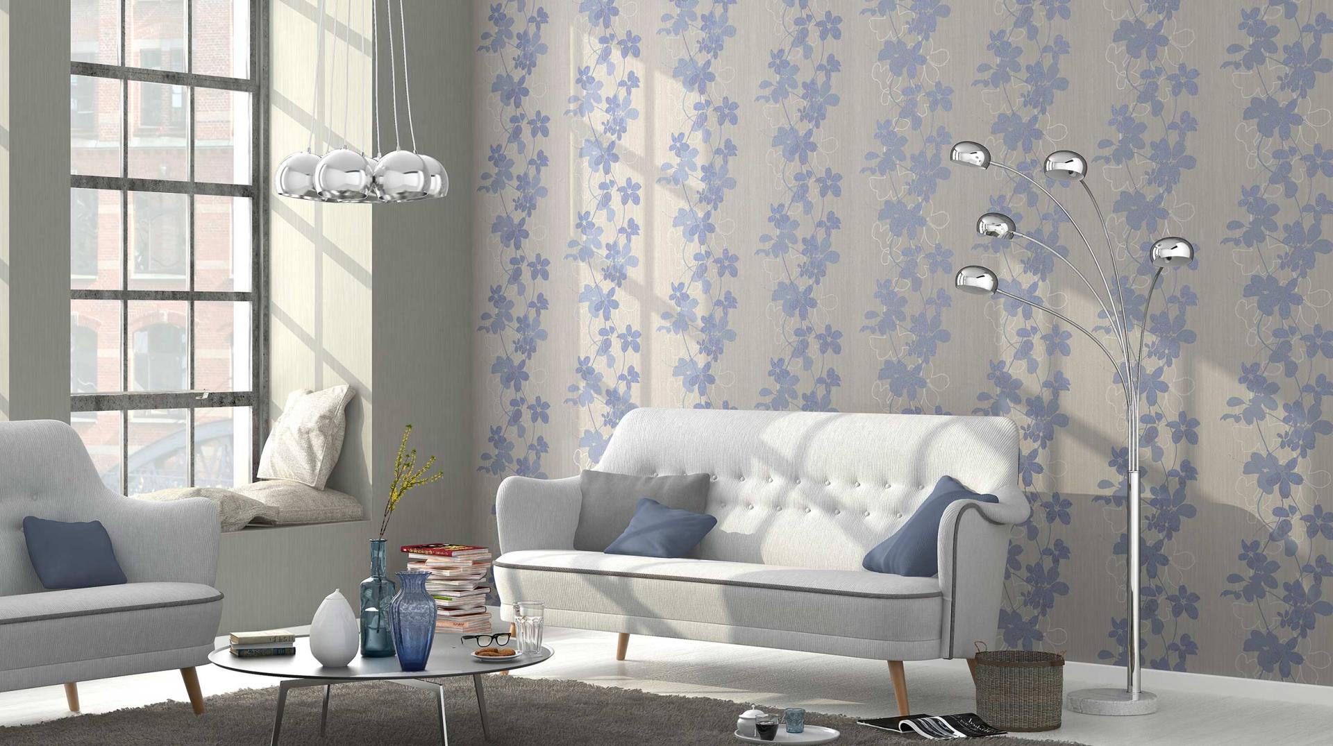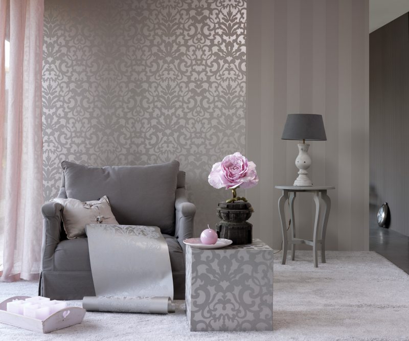 Wallpaper with gray print blends perfectly with furniture of a similar color.