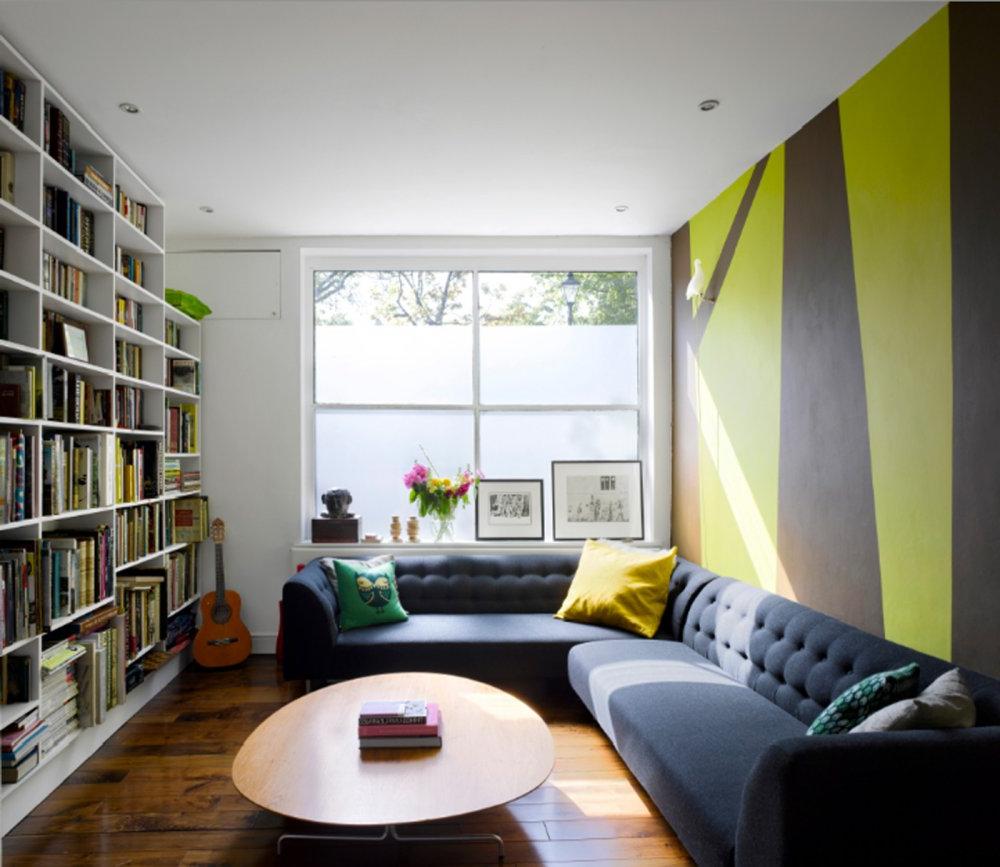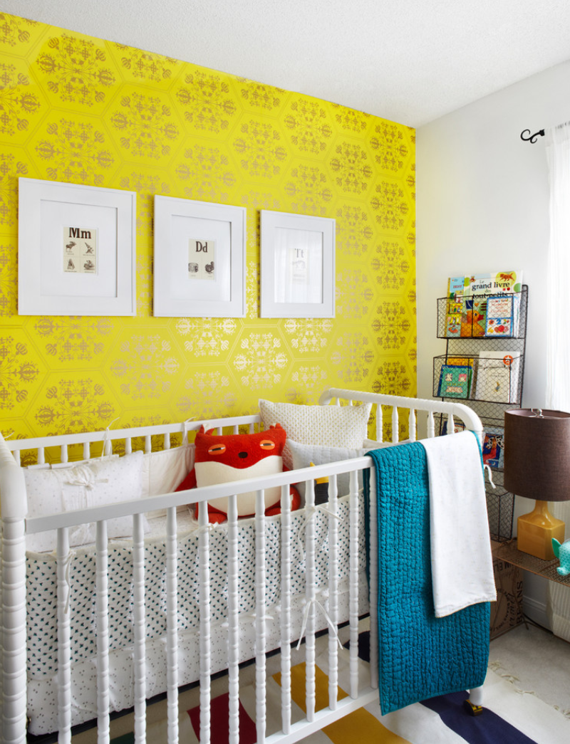 A bedroom with a yellow accent and an unusual solution for sharing diverse wallpapers - the narrow panel also acts as a shelf for photos