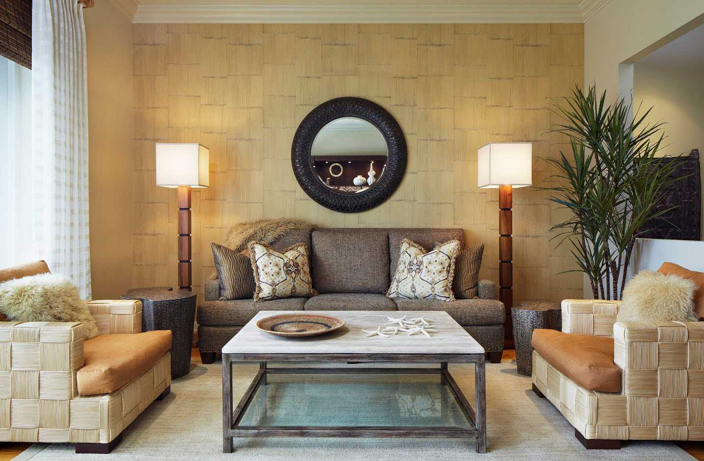 Beige wallpapers make the living room interior elegant and at the same time calm.