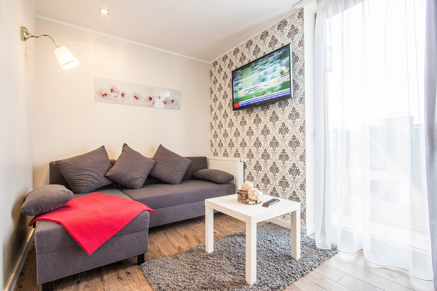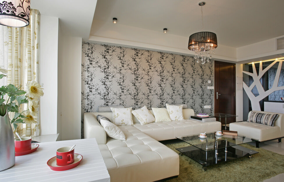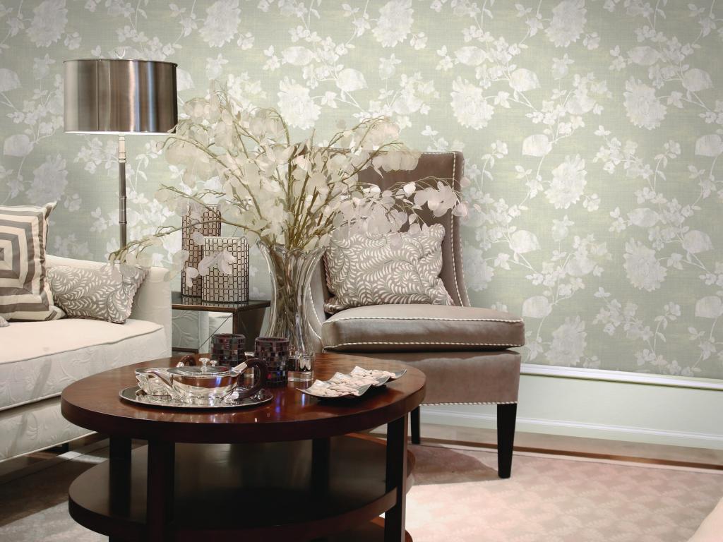 Fabric wallpapers add sophistication and luxury to the living room.