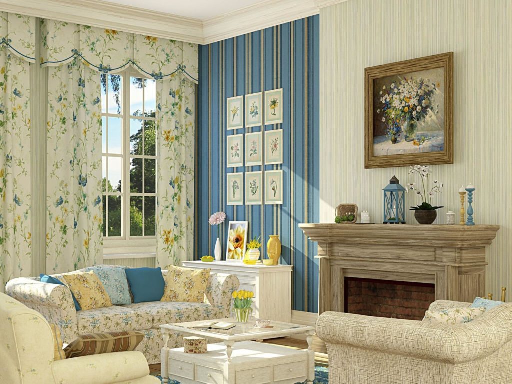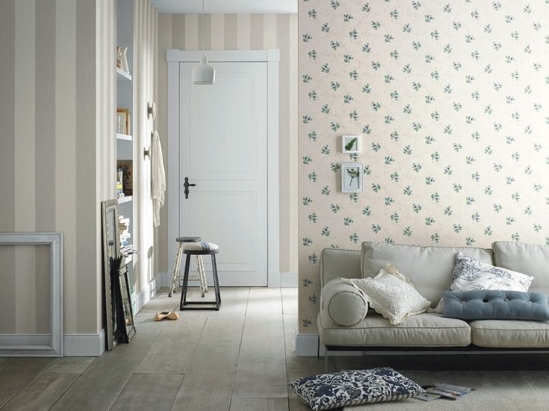 Provence and country - wallpaper in a small flower or with other floral ornaments can be combined with a smooth texture that simulates whitewashing, brickwork, natural wood. The same techniques are used in vintage and retro styles.
