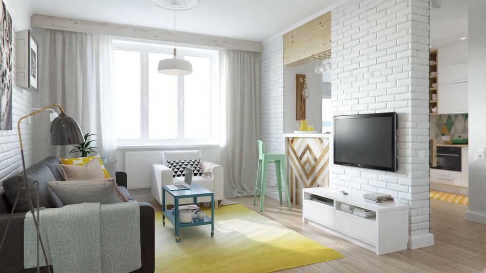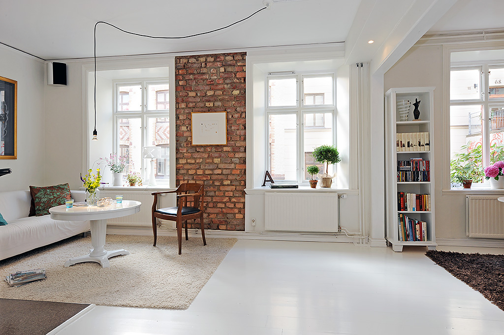 White wallpaper with brickwork will expand the living room in the Scandinavian style
