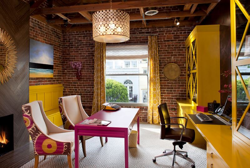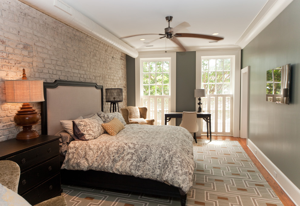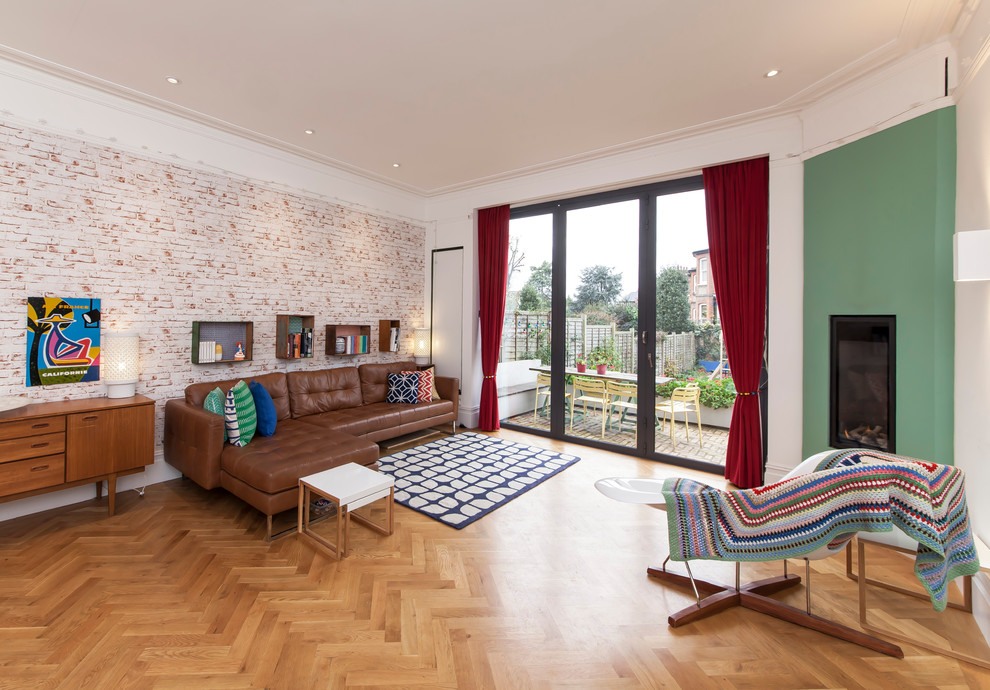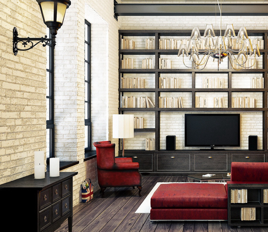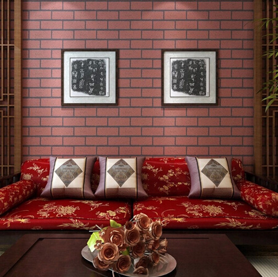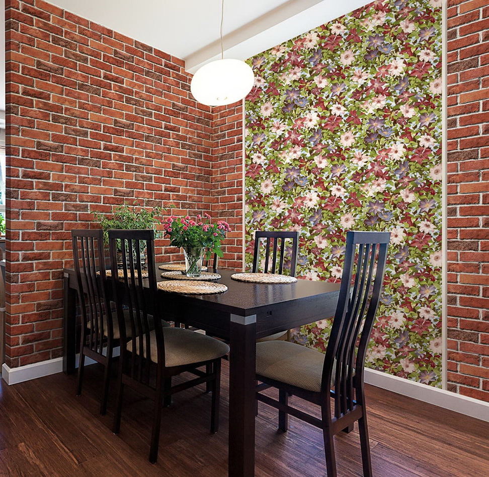 Wallpaper under a red brick looks good with the appropriate attributes - a fireplace, aged wood or suitable furniture