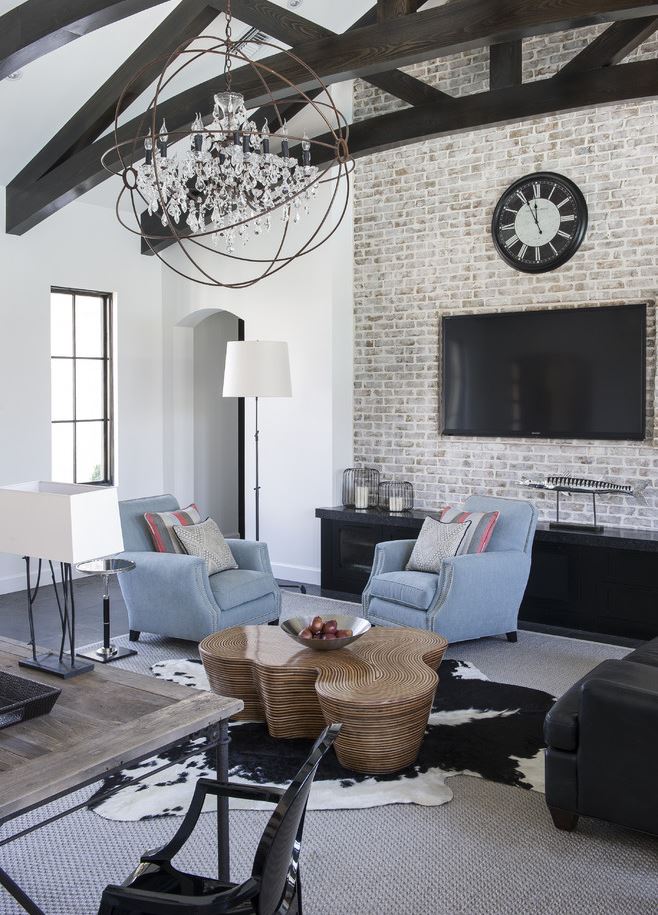 An experimental game is acceptable in the living room - choose any texture, color and size of the brick.It all depends on what kind of furniture, interior styling and color of the equipment will be. The large plasma panel looks great on the accent wall "brick".