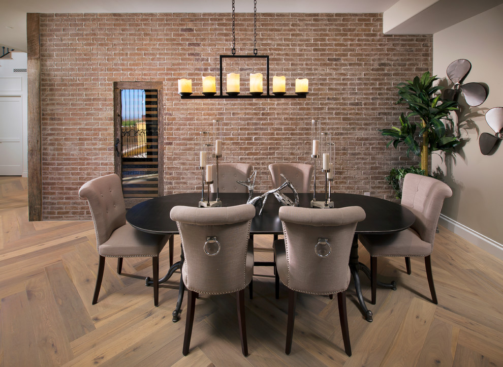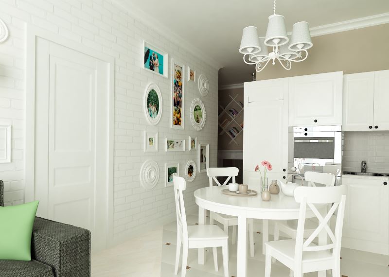 In the kitchen with a wallpaper under the brick, you can highlight the dining area