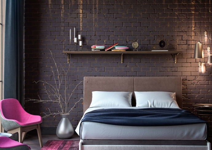 In the bedroom, the "brick" is not used as often as in the above rooms. Nevertheless, it will be organically perceived in an urbanistic or minimalistic interior - for wall decoration at the head of the bed. The same advice applies to one-room apartments, where they use a large folding sofa for sleeping.
