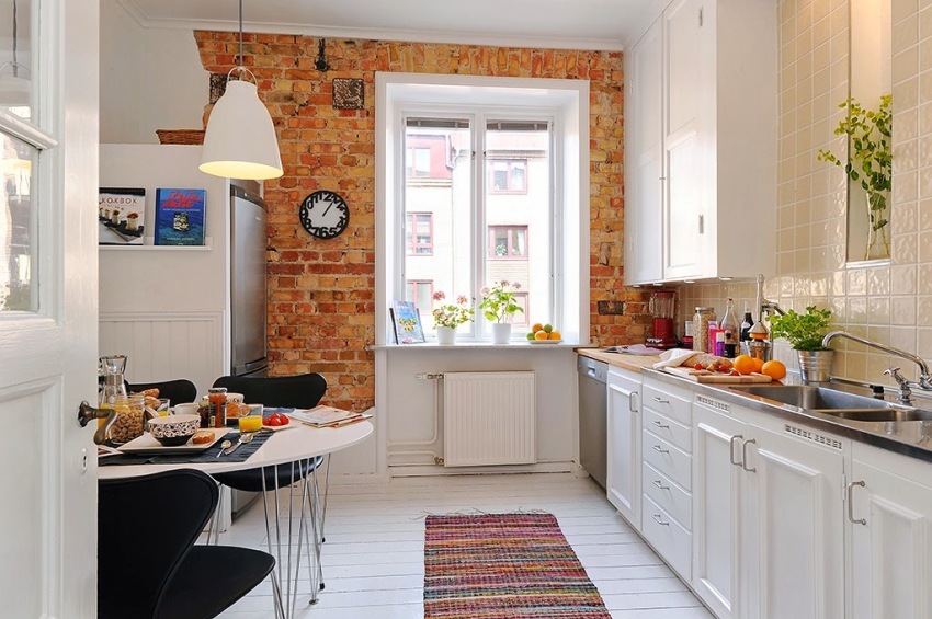In the kitchen, not only a brick wall, but also inserts in the form of an apron near the stove and work surface will look great. By the way, it is better to take not washable paper wallpapers, but a textured version of fiberglass for painting, characterized by counteracting fire. You can even make some kind of graffiti inscription if there is little decor in the room.