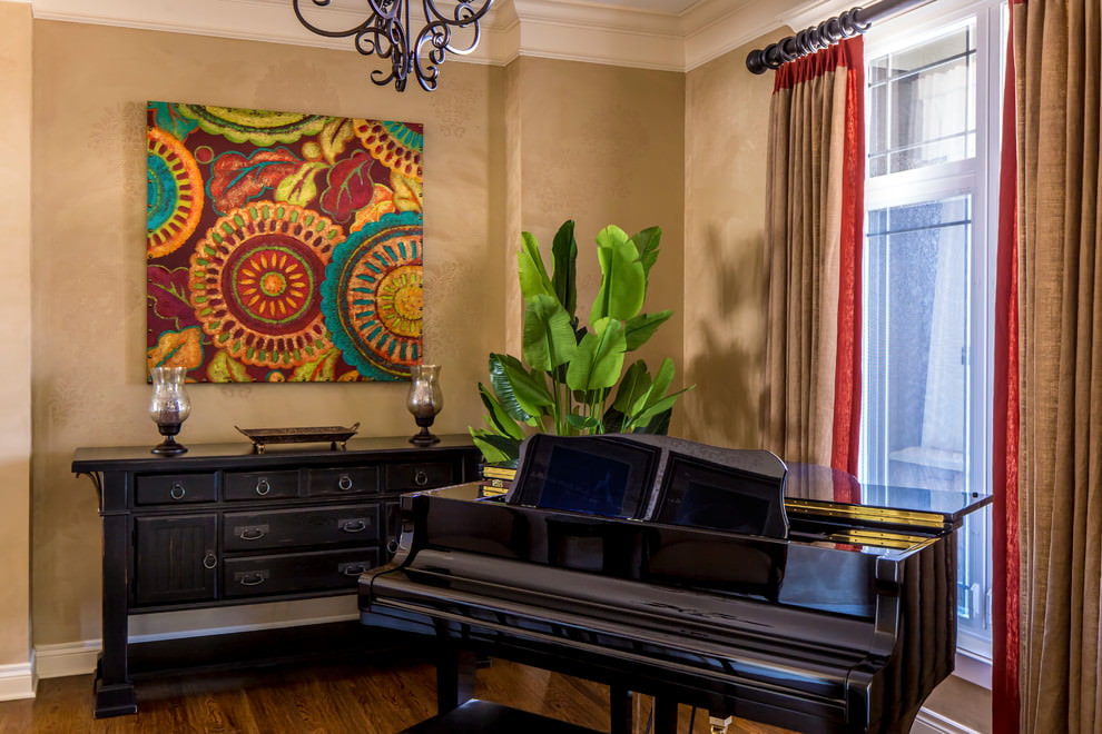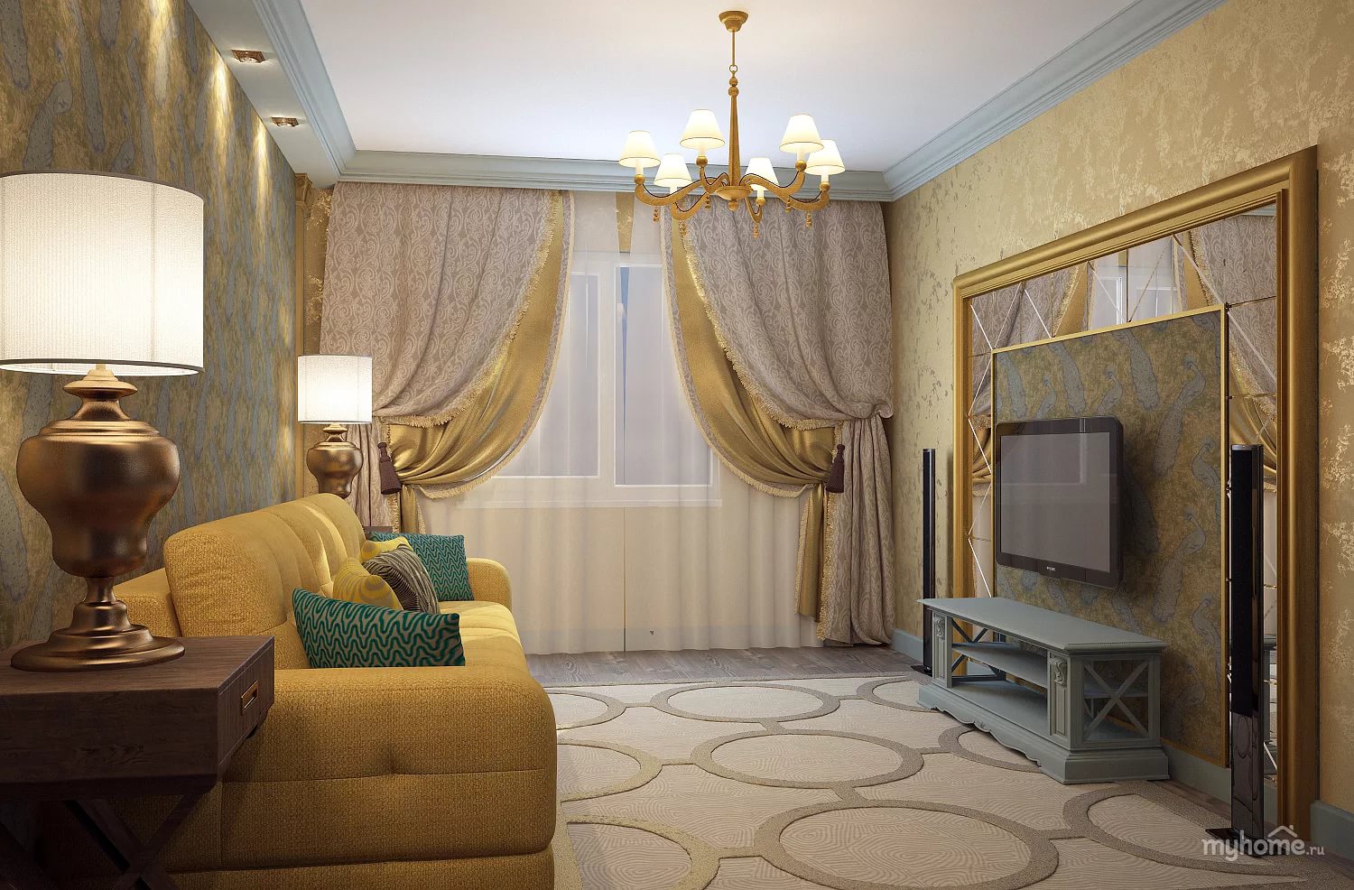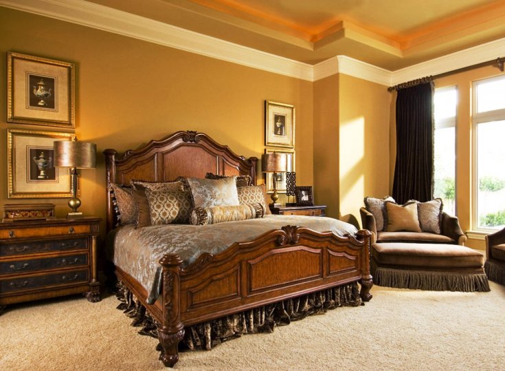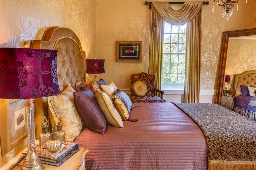 Once upon a time, tons of this metal went to decorate the temple of Solomon and other buildings, which is described in the Bible and other ancient texts. In later times, the use of gold in the interior became mandatory for Orthodox churches and mosques. The tradition of decorating personal weapons and luxury items with gold has survived to the present day. Even if this color is not in its pure form in modern decor, often the upholstery of upholstered furniture is produced with a golden tint, the curtains and tulle are covered with metallic lurex.