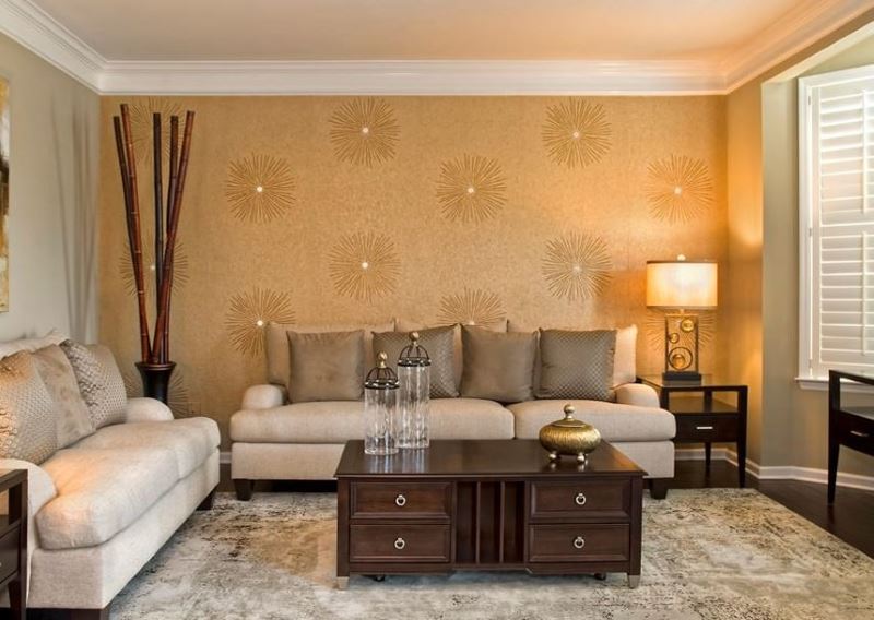 A variety of design options allows you to design rooms with golden wallpaper in almost any style