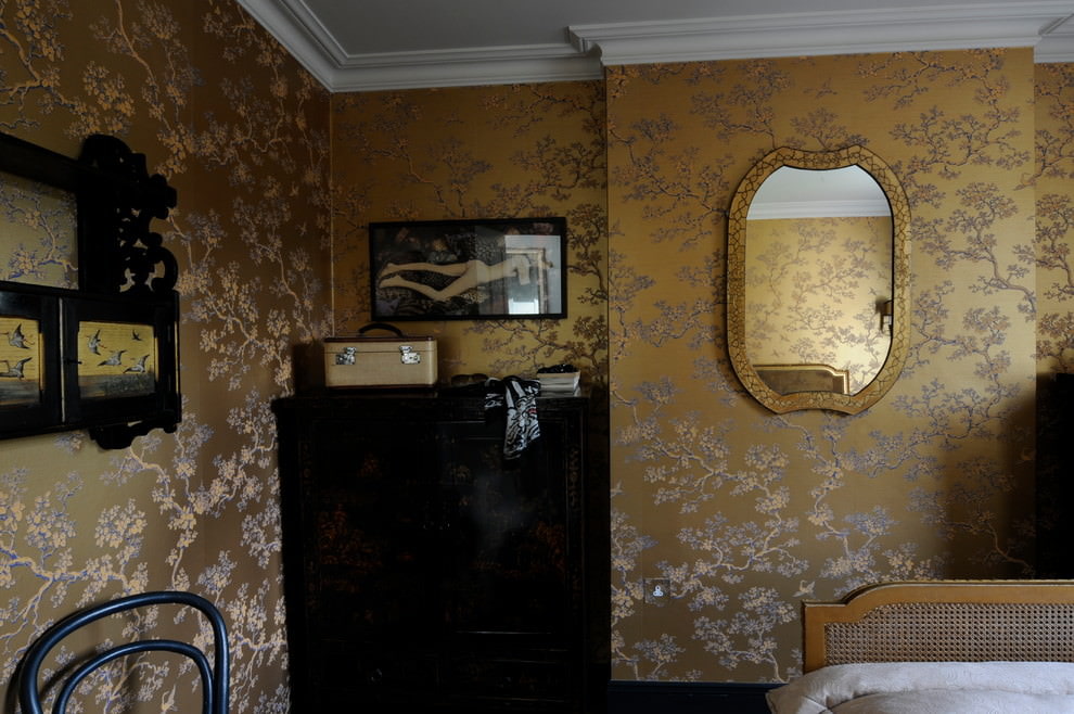To the ignorant in the design, it seems that this color has no shades, but this is not so. In practice, the gold palette is quite multifaceted, ranging from a barely noticeable flickering brilliance to a saturated shade of "old" gold.Golden wallpaper in the interior looks very noble if the pattern is applied on a different basis: