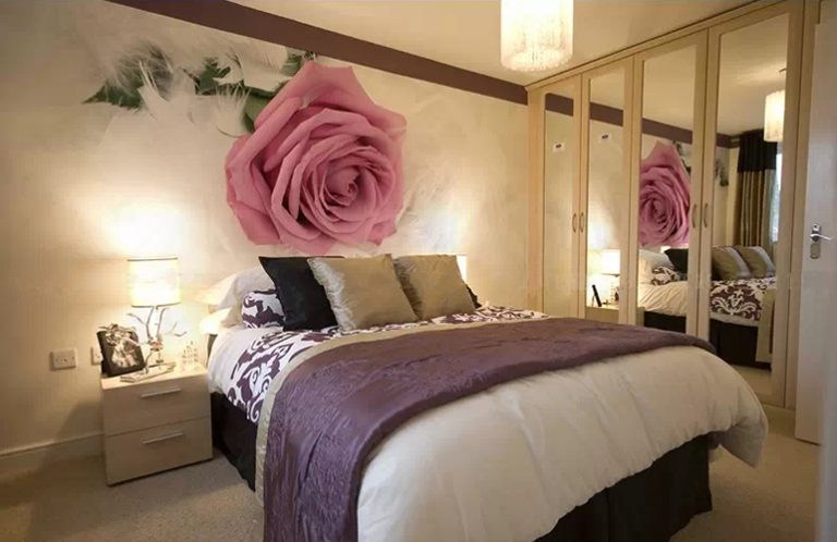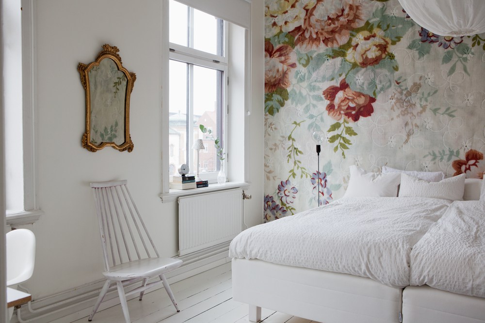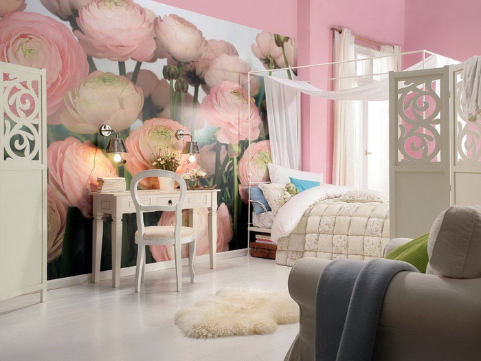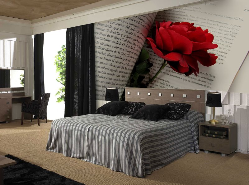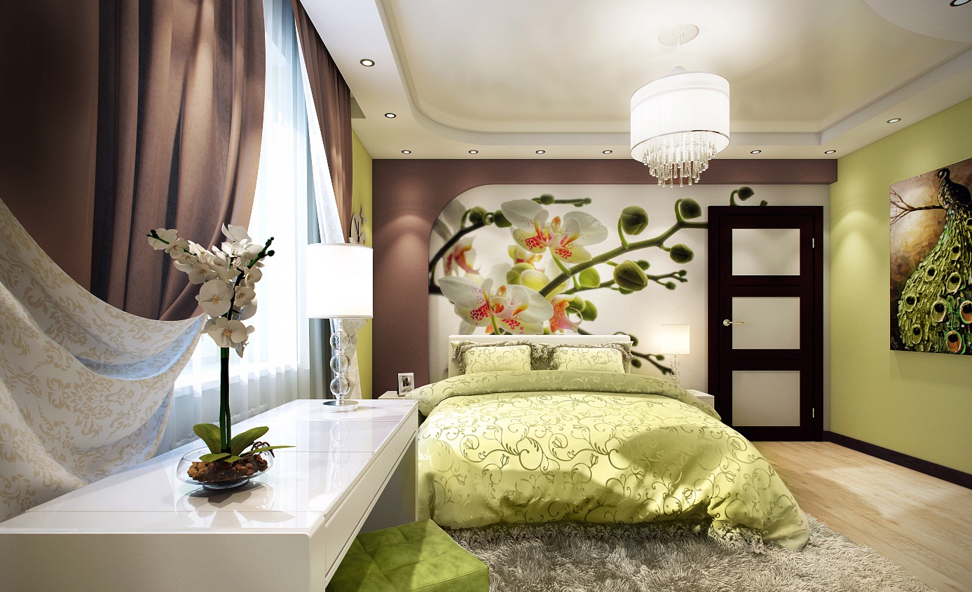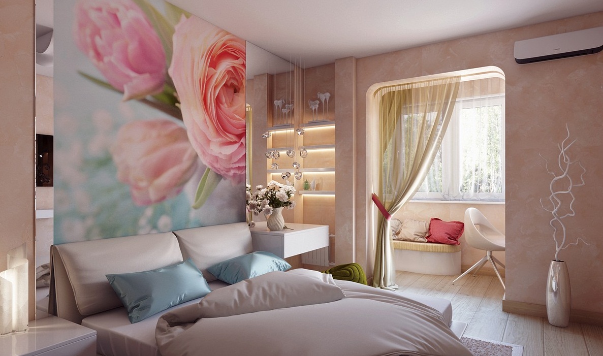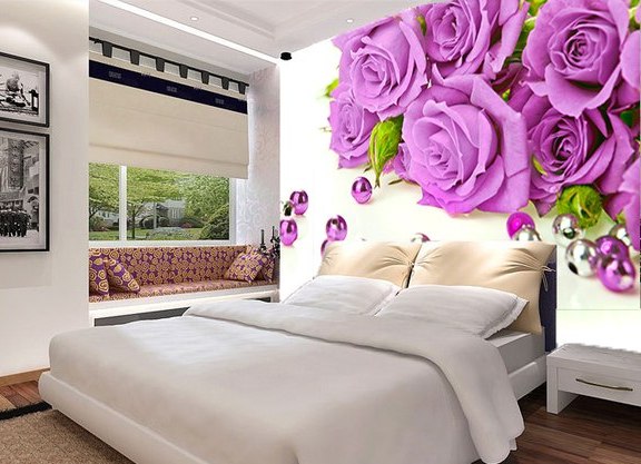 Depending on preferences and the general style of housing, it is possible to choose an original solution in several ways. For example, in the bedroom for husband and wife, photo wallpaper with flowers will work well. A fashionable trend in modern room decoration is large photographs or images of flowers, plant motifs, which are located on the wall space at the head of the bed, especially if the room is small.
