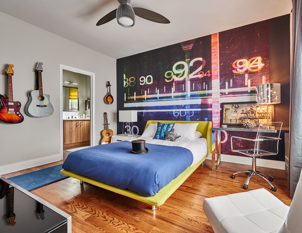 For youth bedrooms, wall-paper with images of musical instruments, images in the style of steampunk and cyberpunk, scenes from films with photographs of heroes and artists are popular.