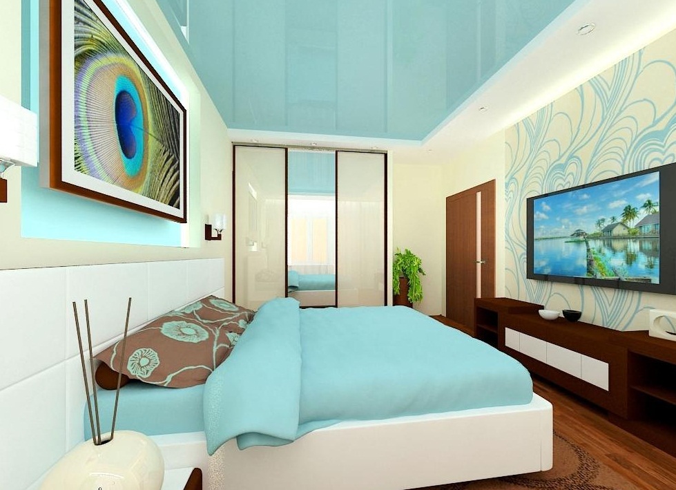 - Photowall-paper in a bedroom can be also a bright center of a design composition, an element of the general decor, replace a ceiling covering.