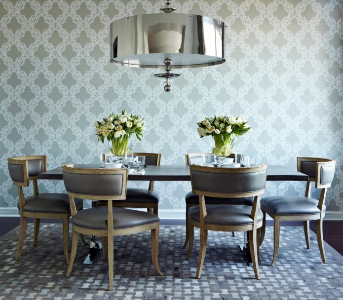 Regarding the choice of ornament on gray wallpaper, there is only one rule - it must correspond to the style direction of the room design. For example, geometric patterns (rhombuses, circles, stripes) are more suitable for art deco, high-tech and retro styles. Ornate complex motifs made in white or gold are characteristic of classicism and modern style.
