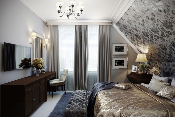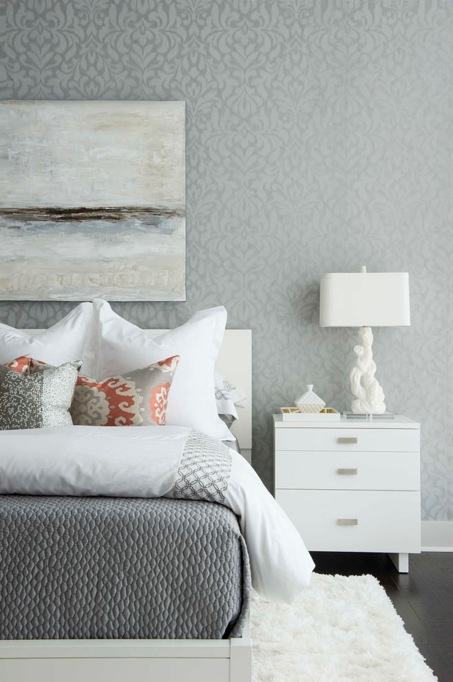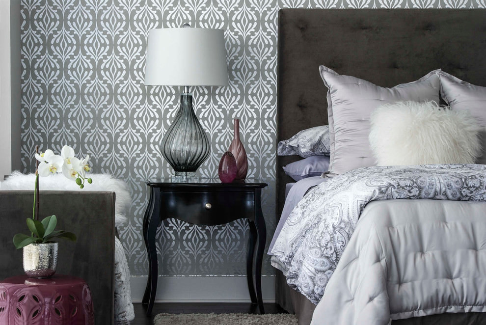 Gray wallpaper with ornament, ideal for creating a classic style in the bedroom.