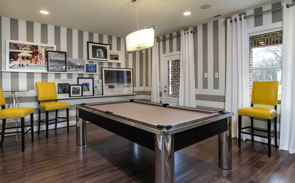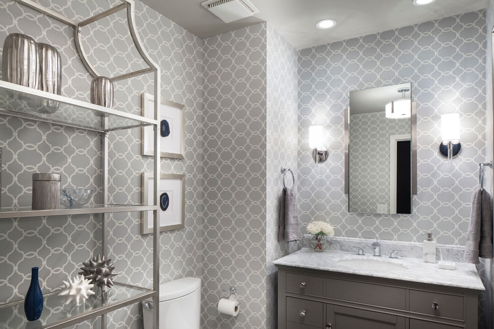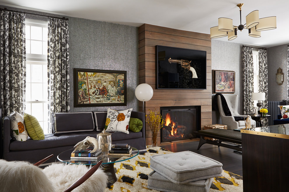 Gray wallpaper can be wall mounted by the fireplace or TV.