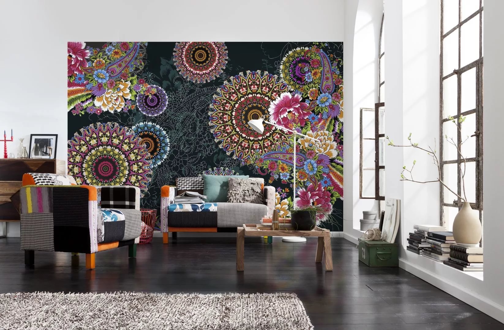 For a maximalist design, it is better to take wallpapers with large colors and with ethnic pictures.