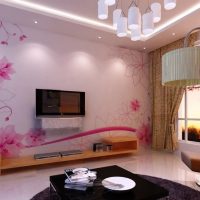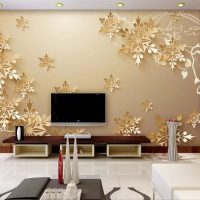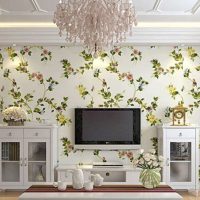 Thanks to its uniqueness and durability, the murals are once again gaining popularity. You can add coziness to the living room using images of the fireplace and fire. An imitation bookcase will add sophistication and aristocracy. Cloths with plant motifs are in demand. They are used to transform the premises into a corner of the wild. The most current trend of 2019 is bamboo thickets in bright green and yellow shades. In a small room, the small flower wallpaper looks good. But for a spacious living room, large flowers are suitable in combination with plain wallpaper.