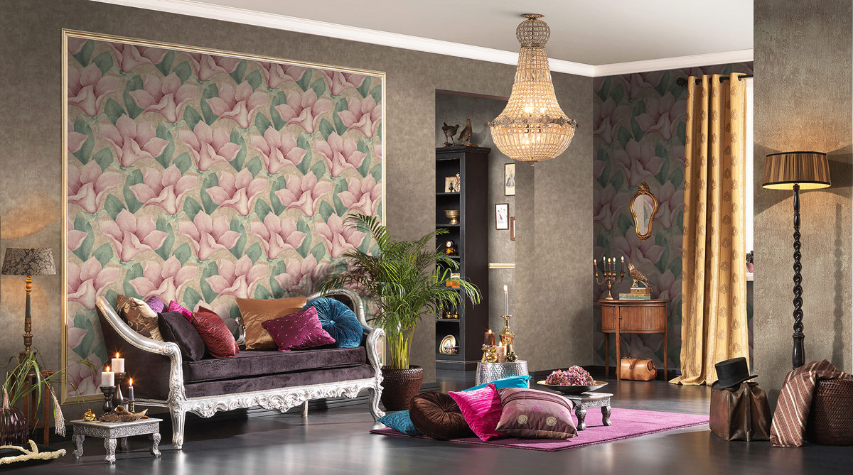 The Indian style is characterized by vinyl textured canvas with thematic ornaments, as well as walls that mimic expensive fabrics.