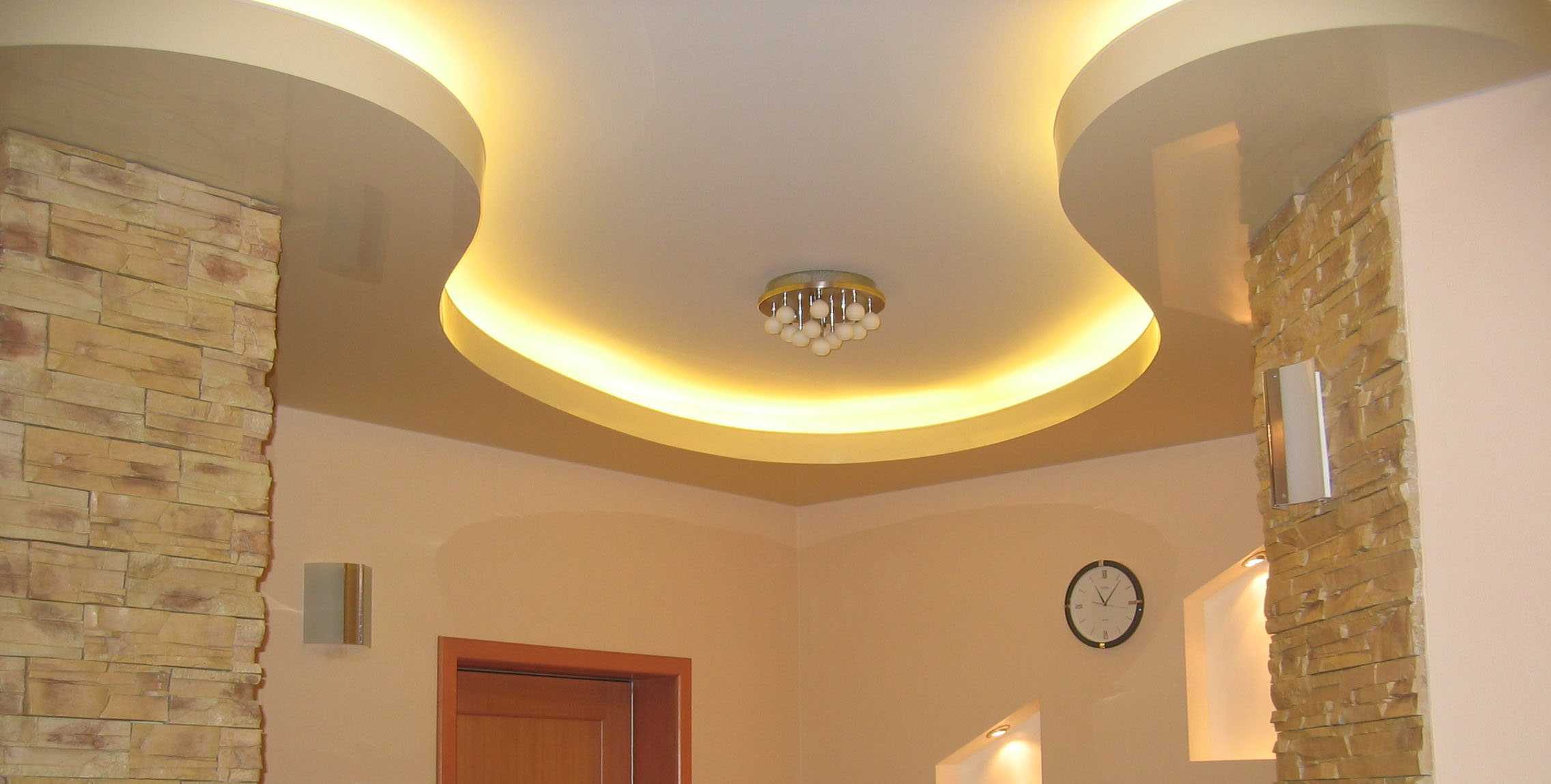 Let's move on to the design. Drywall is flexible in processing: you can create any shape, many protrusions and steps. It even allows you to create various shapes and silhouettes.