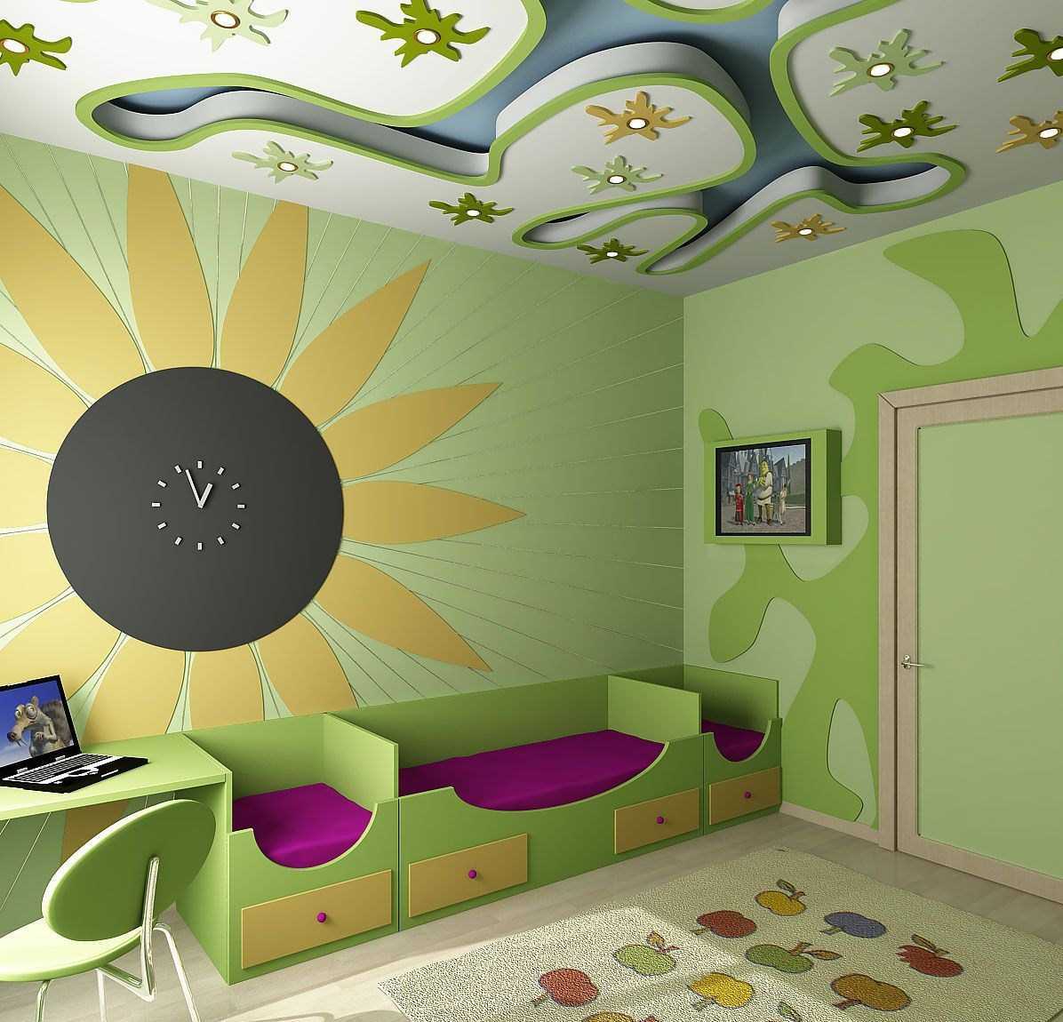 Another option available is wallpaper design. You can combine their various types, cut out any shape of the surface (for example, create artificial waves). You can pick up a neutral background and use ceiling stickers. Or purchase a wallpaper.
