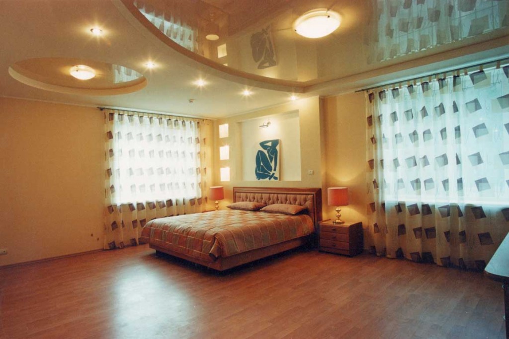 Proper design of the ceiling in the bedroom with low light by natural light should not be too complicated.