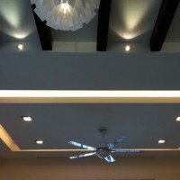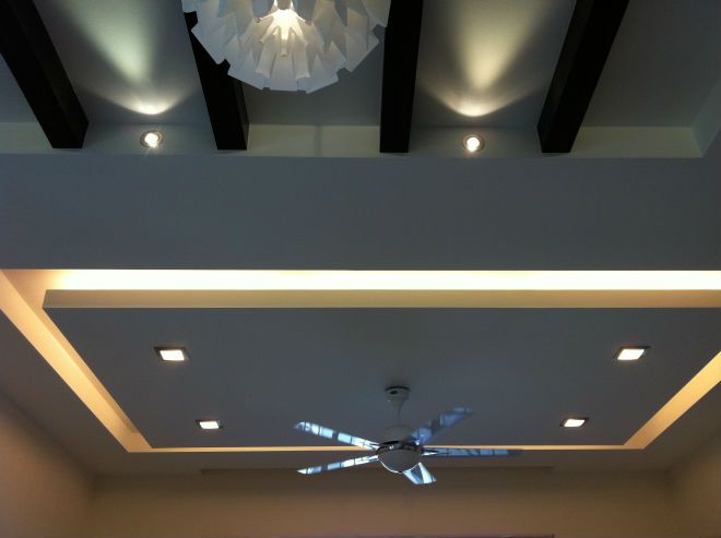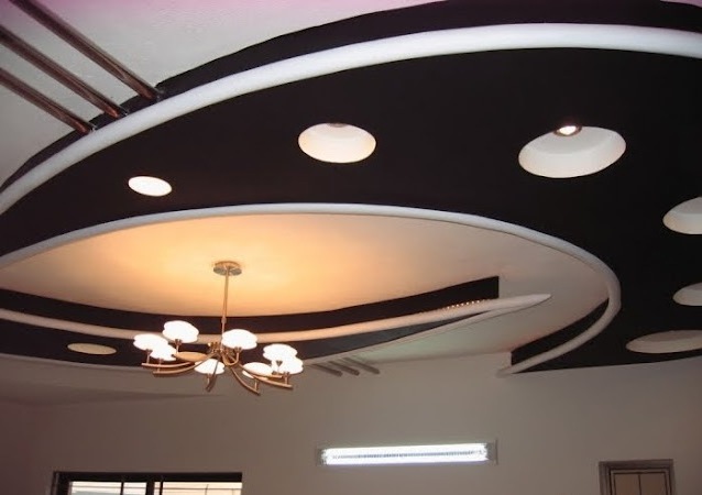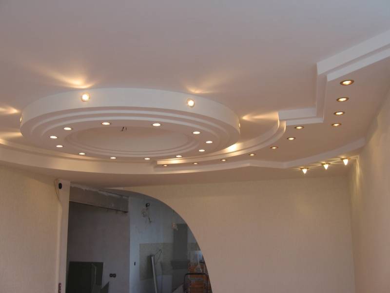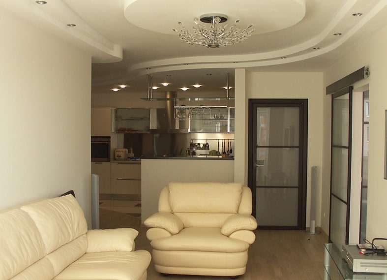 If the size of the living room allows you to equip a kitchen and a relaxation area there, then two-level ceilings are used here as separators of functional areas and places where communication is hidden. In such a plasterboard ceiling, additional lighting and ventilation equipment are hidden.