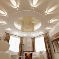 - Quick mount. After installing a two-level stretch ceiling in your living room there will be no need for putty, grout and paint. Therefore, installation takes much less time than installing a plasterboard ceiling.It is only necessary to find an experienced specialist who can perform these works efficiently and in short lines. But not every master can do it, since the correct installation requires a certain amount of knowledge of geometry, and not just the ability to correctly mount the profile and stretch the ceiling. In addition, the more complex the configuration, the more laborious the installation work.