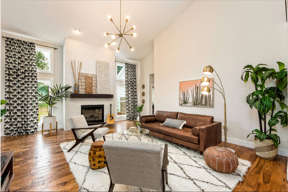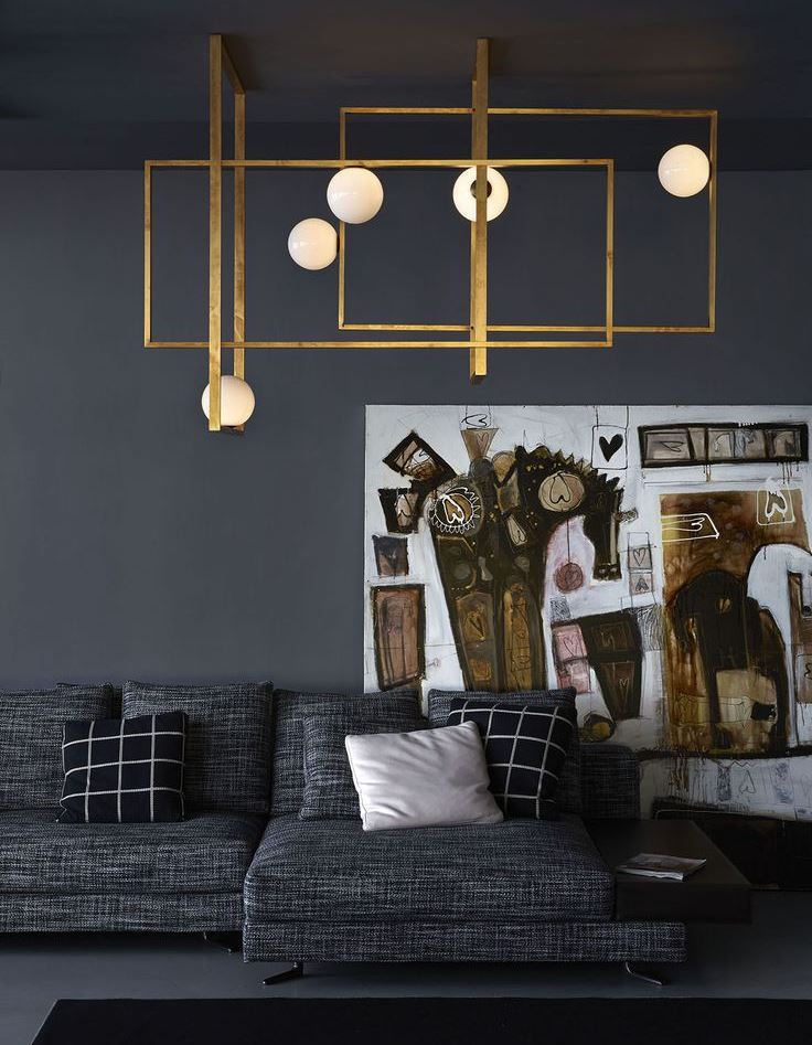 For a spacious living room, a pair of identical pendant lights is a rather often used technique that allows you to illuminate a large area and create an original interior