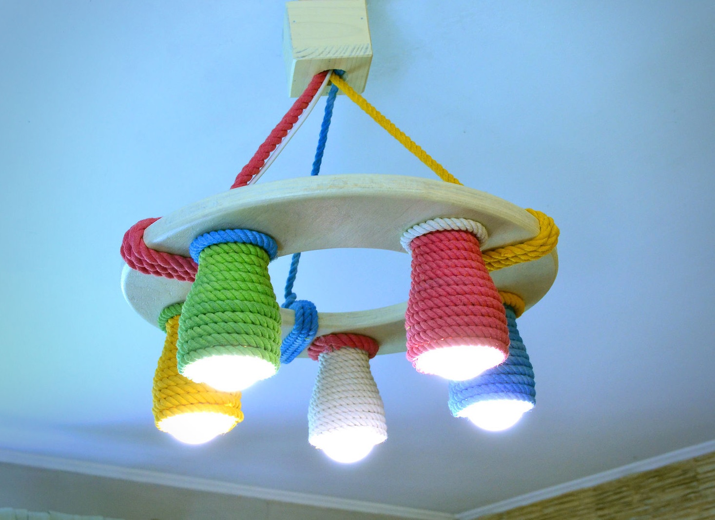 The second option (colored lamps) is appropriate in children's rooms or even in the kitchen (in the style of country, pop art). This approach will fill the room with immediacy, lightness, playfulness.