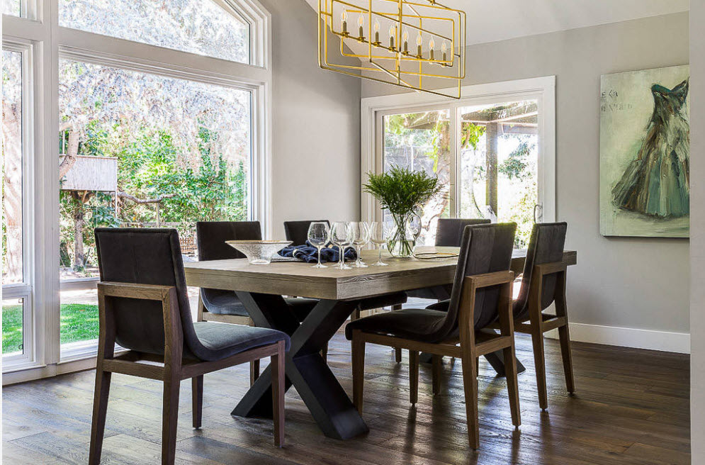 A well-chosen diameter of the chandelier that acts as a zoning of the dining part of the kitchen