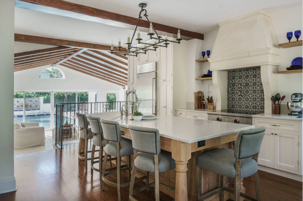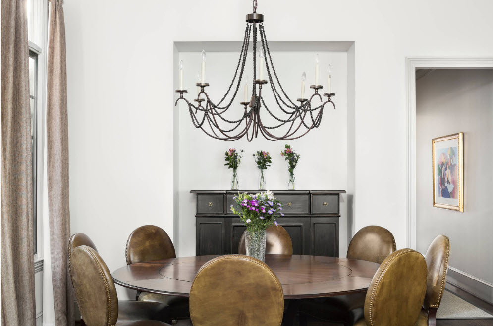 The black chandelier looks extravagant and goes well with the bright interior and high white ceiling.