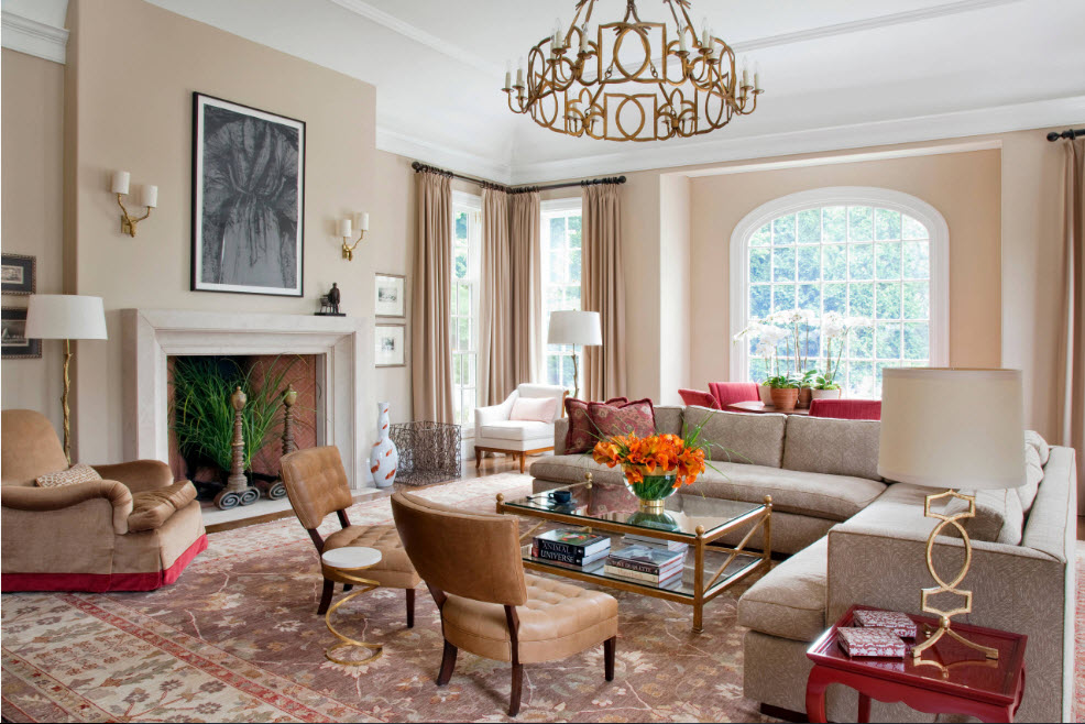 The ceiling lampshade in the living room may have additions in the form of gilded chains, candlesticks, decorative elements made of metal, bronze, glass or expensive natural stones. It is worth considering that the chandelier for the interior of the living room is not bought so often, and even if after major repairs you still decide to change the shape of the central electric lamp, you will not want to perform the next such replacement soon. That is why it is worth paying special attention to the choice of a chandelier and it is advisable to buy the most practical option.