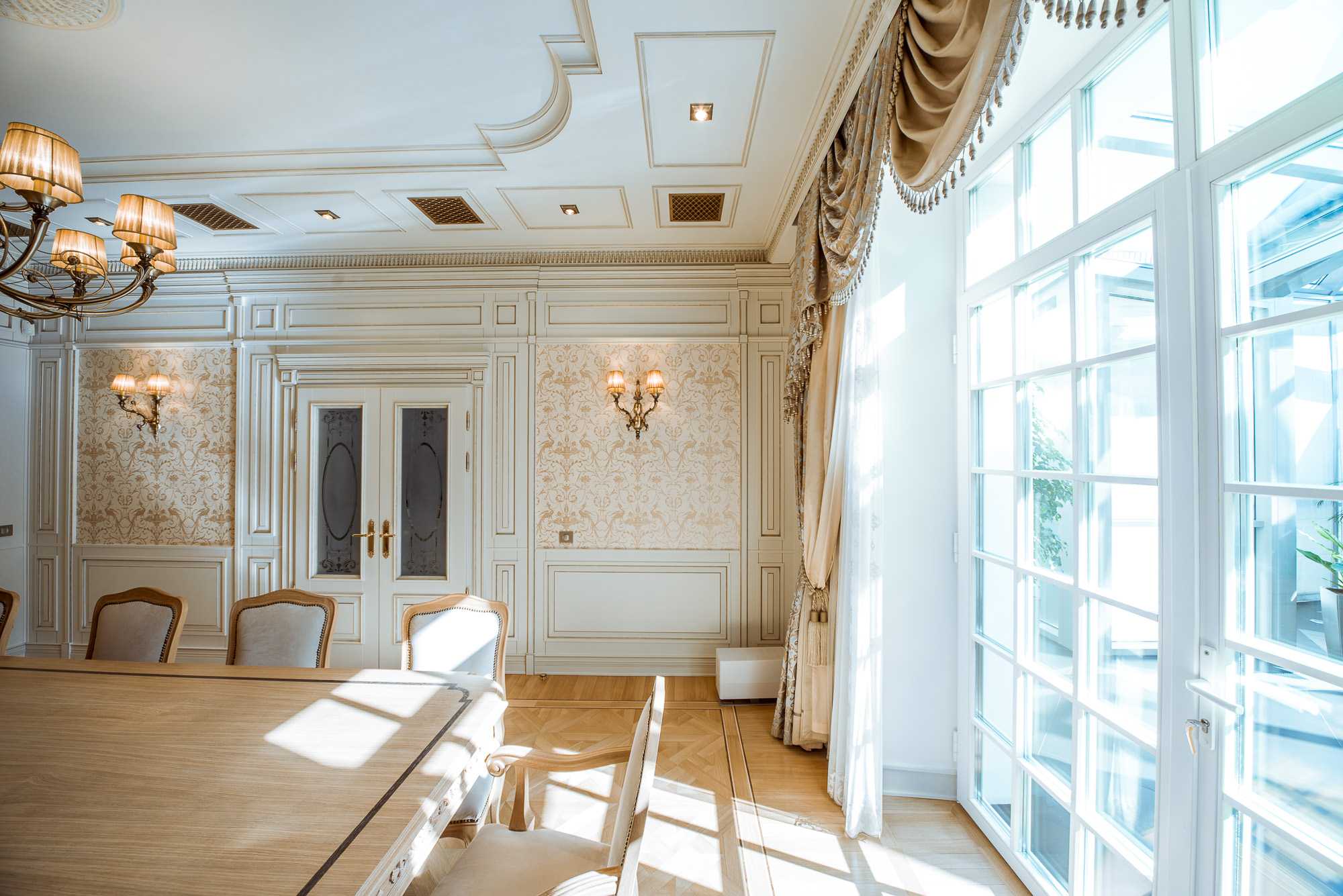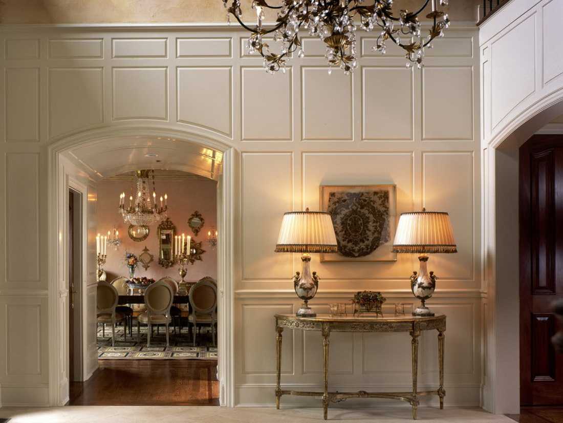 - Plasterboard panels combine with mirrored surfaces and create an inimitable look in the living room or bedroom. Thanks to plaster and gold moldings, you can create an exquisite interior of a classic style.