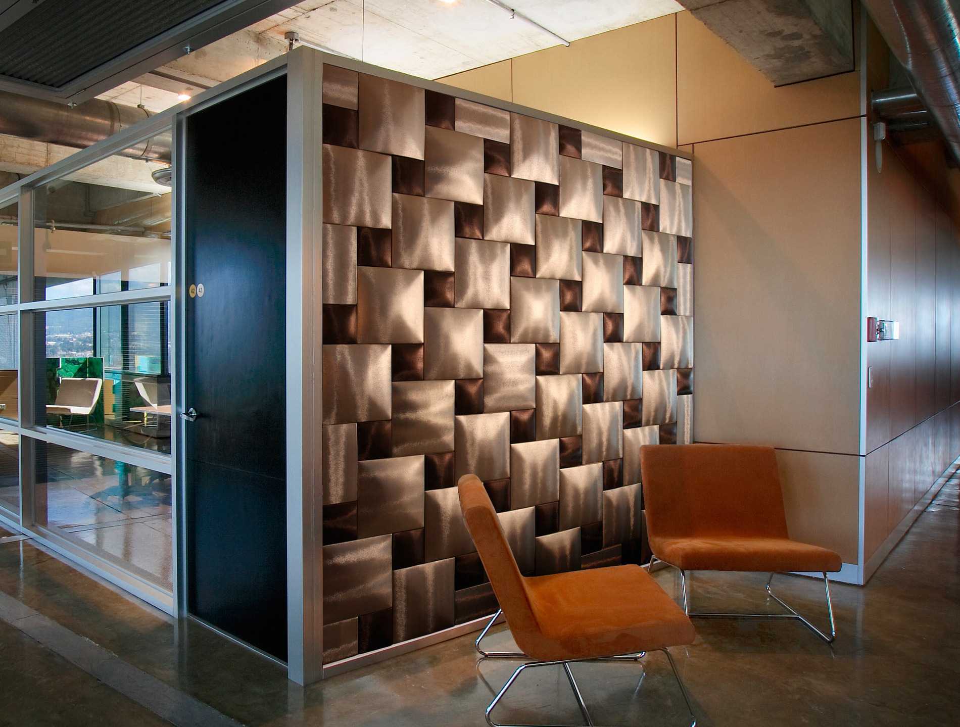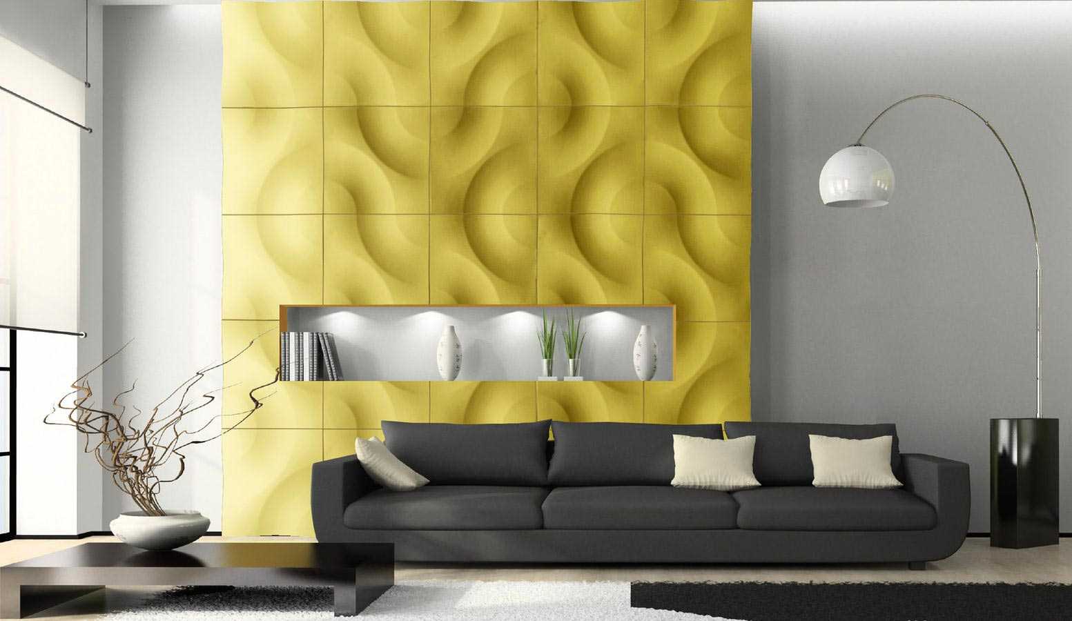 - Tile panels - square from 30 cm to 1 m. Fastened with steel plates for fastening or glue. If you assemble the wall panels on the plane in different ways, then you get interesting options for wall decoration. With the arrangement of plates at different angles and several levels, you can get the original interior decoration. The final touch will be the backlight built in between the levels.