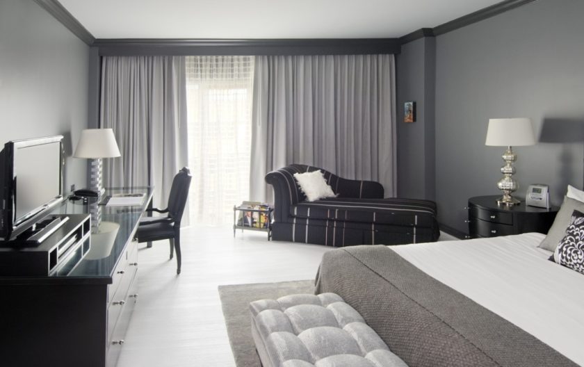 Thick black curtains on the floor complete the stylish discreet bedroom interior