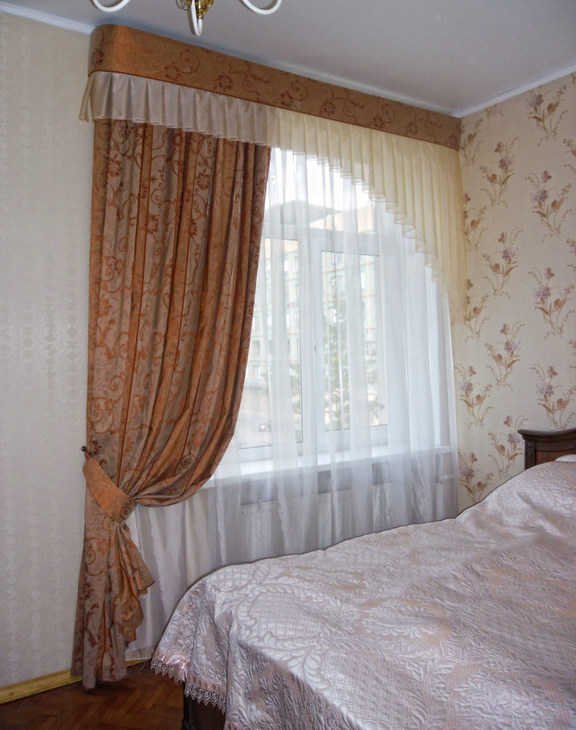 - Draperies - two canvases with a horizontal lambrequin. Materials - jacquard, velvet, chenille, silk, from the decor there are brushes, embroideries, beads. Suitable for classic style, baroque, many others.