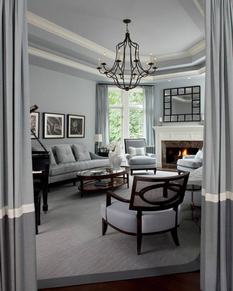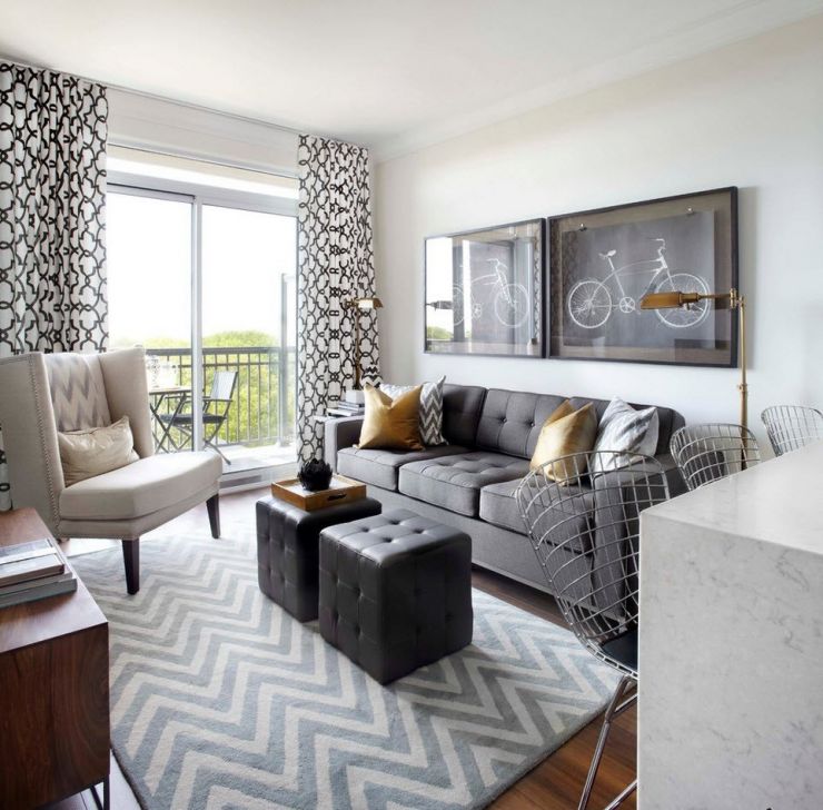 The living room, where there will be gray curtains, will become sophisticated and elegant. If you want to create a gentle, cozy atmosphere, add romantic details to the room, just a little. Observe moderation when creating an interior in the living room.